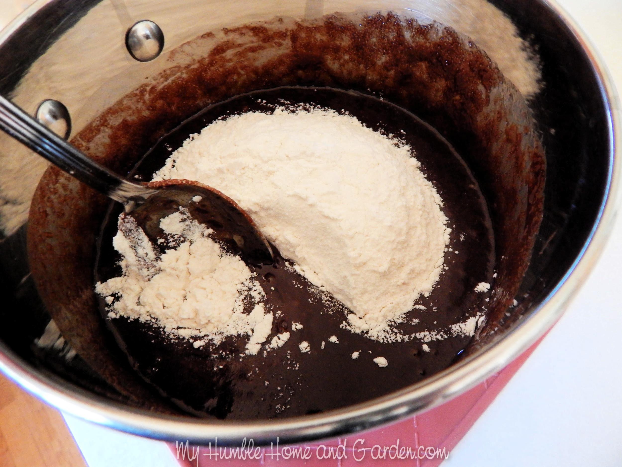 *Grease an 8″x 8″x 2″ square baking pan and set aside. In a medium saucepan, melt the butter and chocolate over low heat. Stir in sugar, eggs, and vanilla. Using a spoon, beat lightly by hand just until combined. Stir in flour.