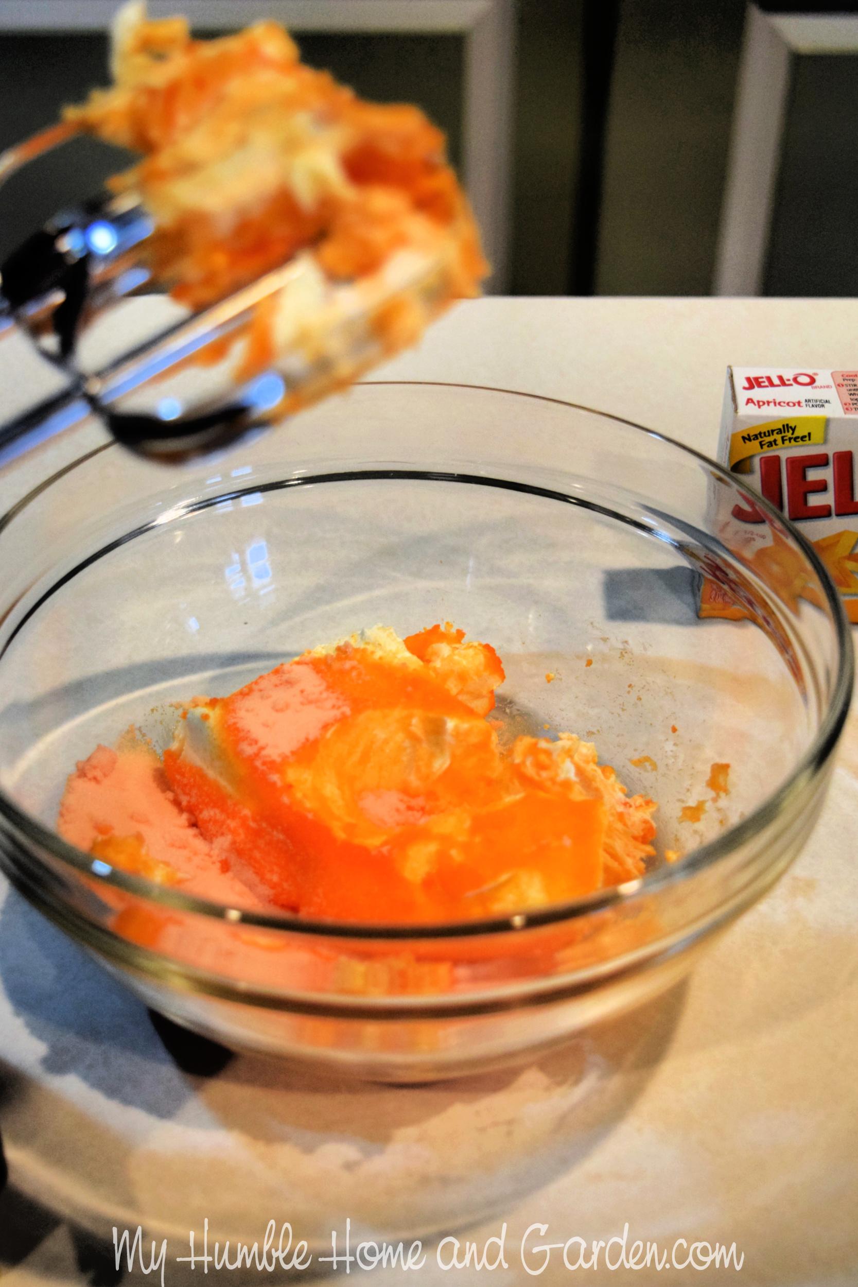 Mix the softened cream cheese and the powdered JELL-O -You’ll Love This Crazy Good Little Apricot Peach Dessert #peachdessert #peach #apricotdessert #minidessert