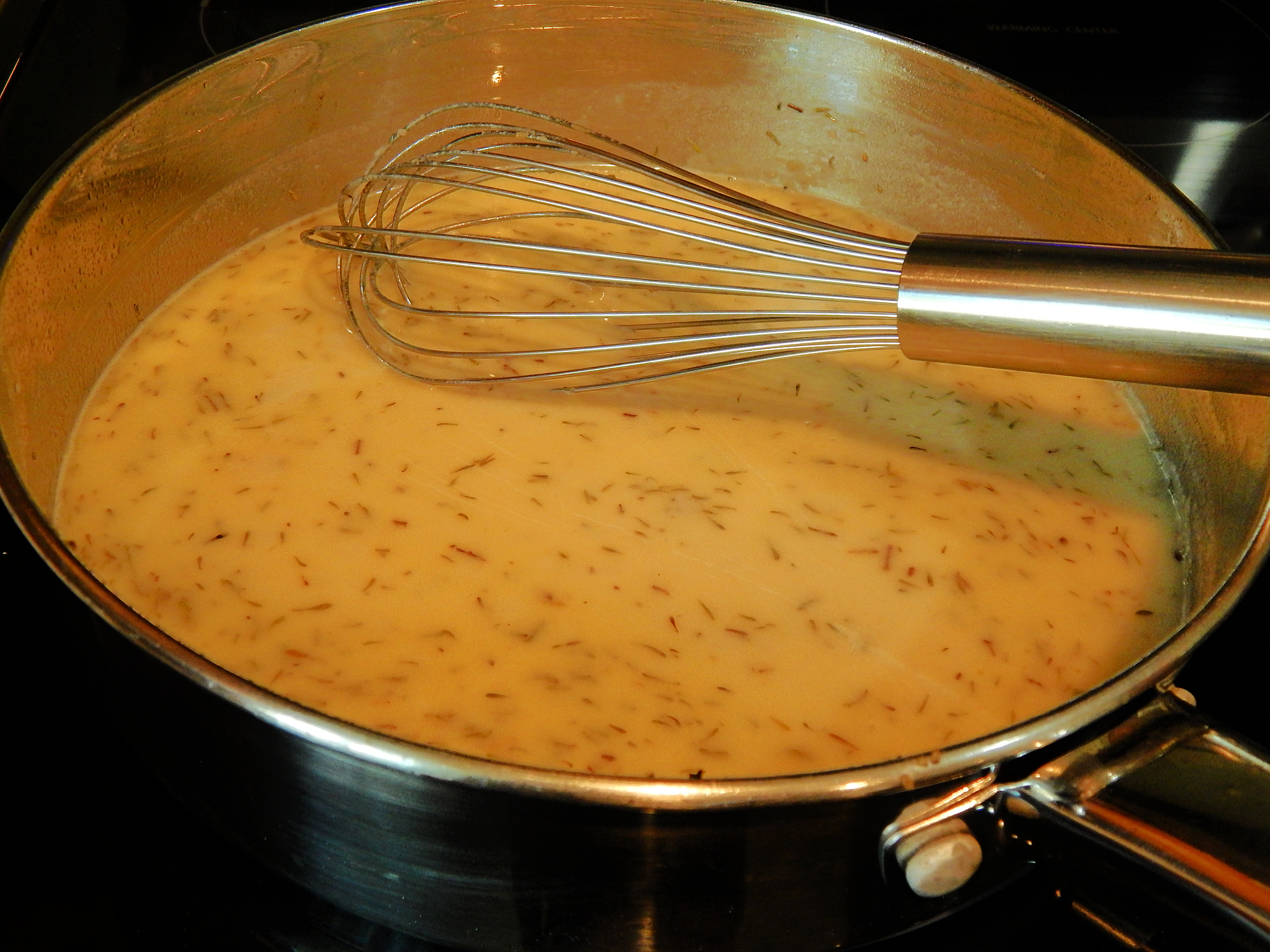 Gradually whisk in the chicken broth and the milk.