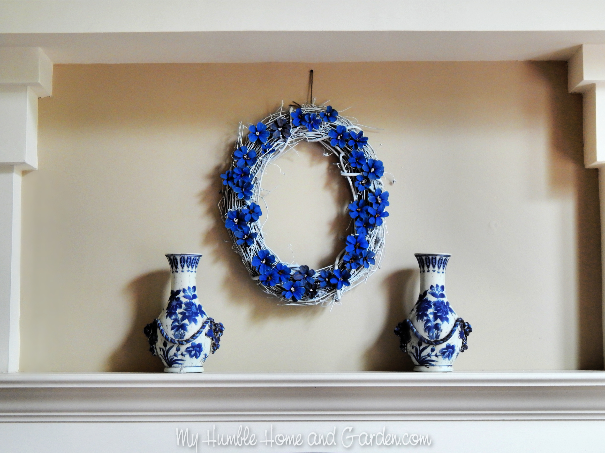 Create One Beautiful Blue And White Mantel Display – Hang the wreath above the fireplace mantel and add two blue and white vasesl. #wreath #blueandwhitewreath