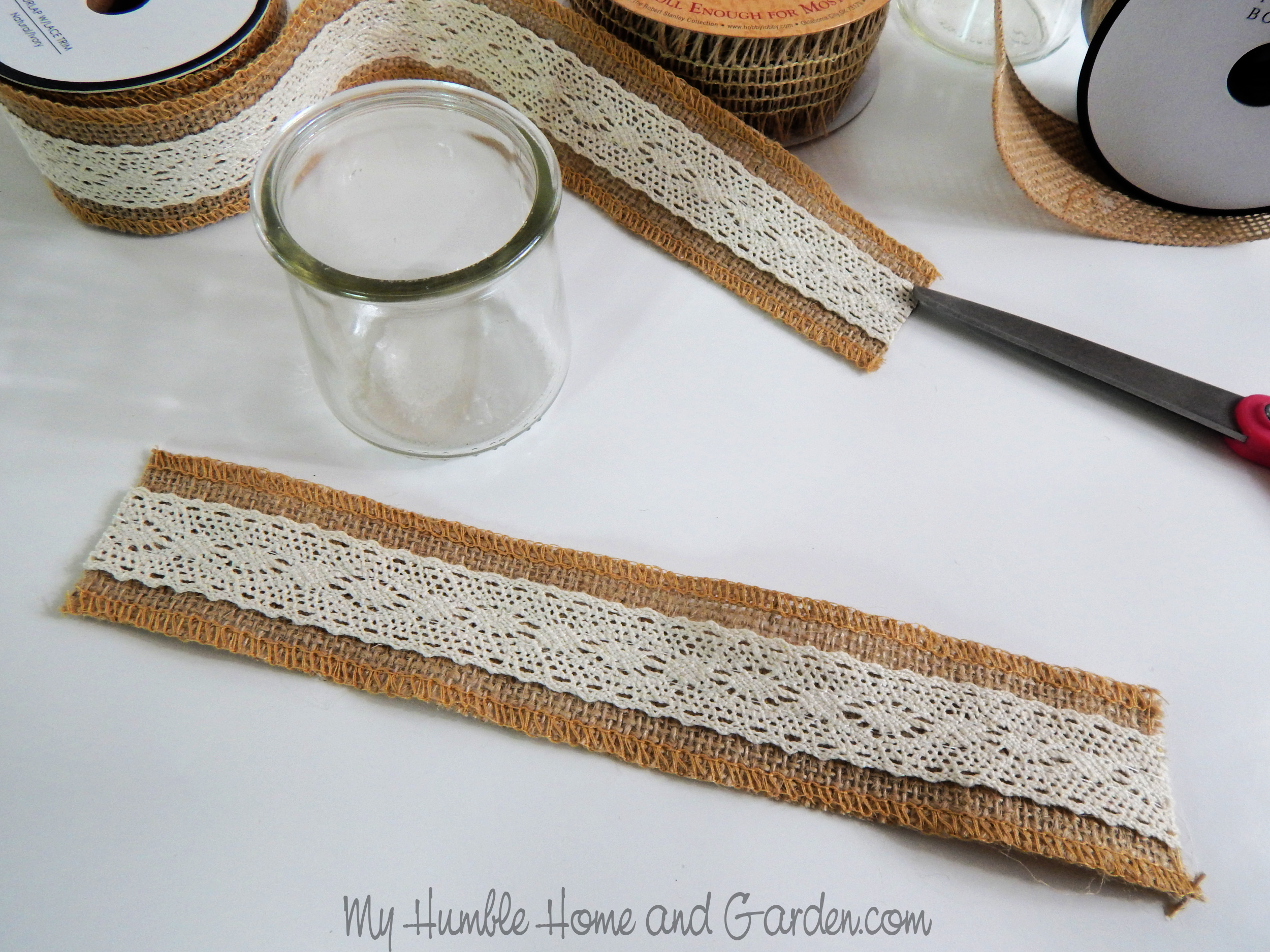 Cut a piece a little larger than the jar Posted on 2021-07-102021-07-10Full size 2500 × 1875 Cut the trim a little larger. Shabby Chic Burlap Trim Yogurt Jars Easy DIY