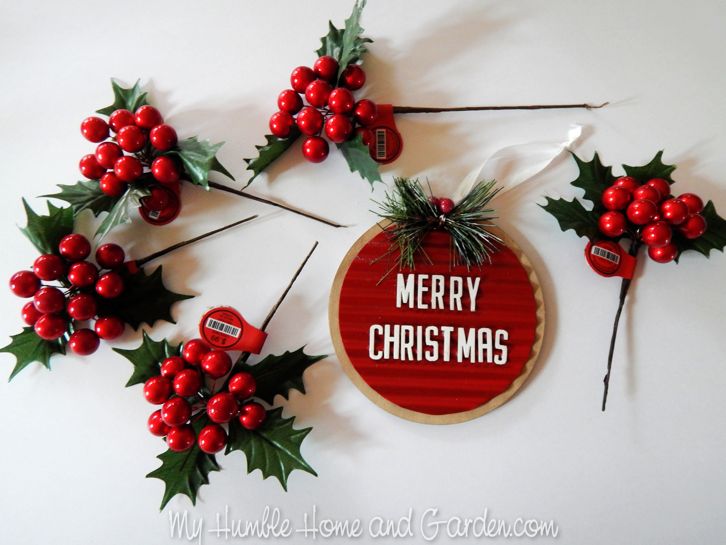 At this point, my granddaughter, Sophie, and I made another trip to the craft store. Perusing the aisles of Christmas ornaments, she spots this Merry Christmas ornament, and it seems perfect for the wreath.