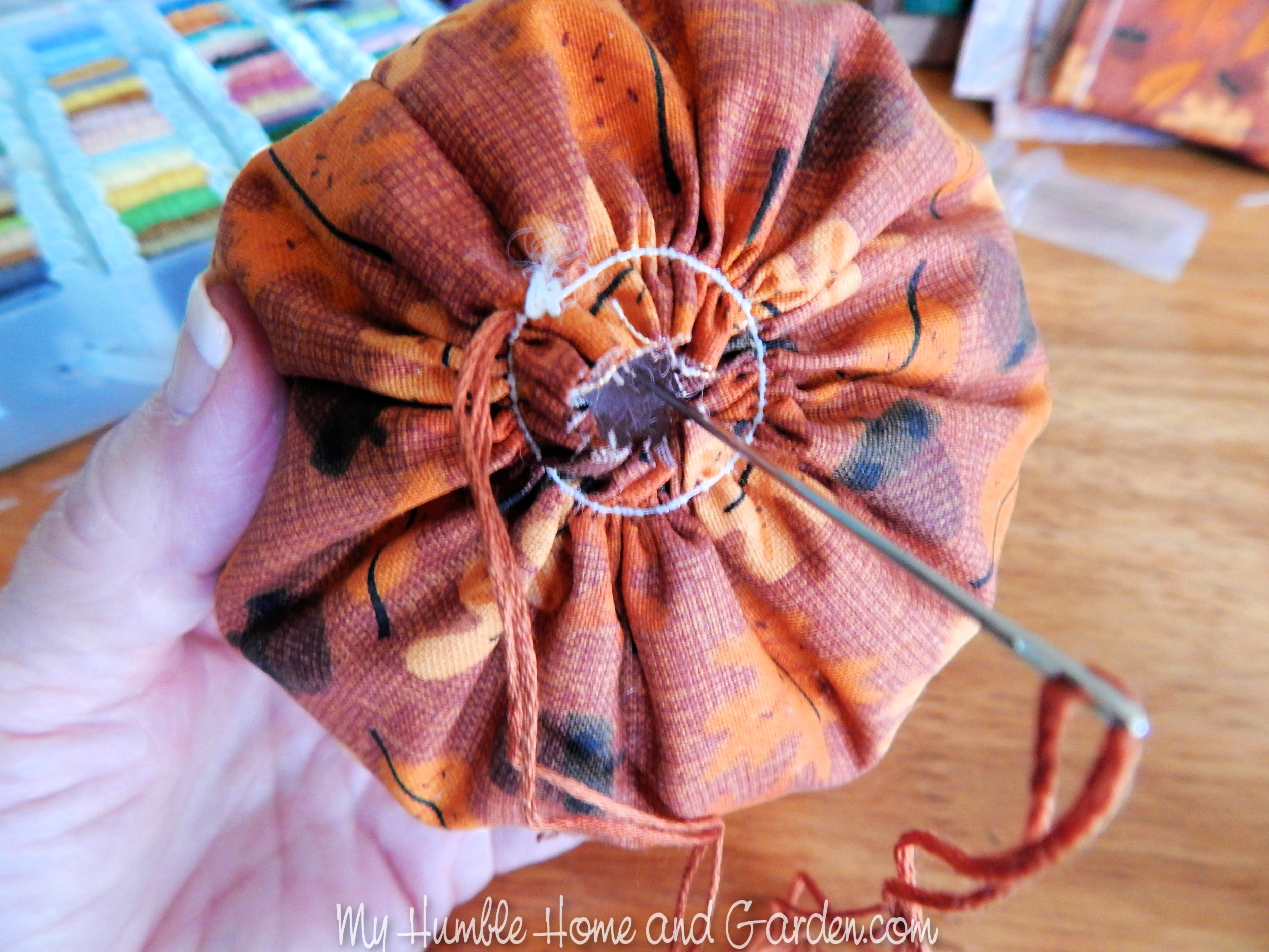 Run the needle thru the stuffing to the center of the bottom. Posted on 2021-09-012021-09-01Full size 2500 × 1875 Run the needle thru the center bottom. How To Easily Make Cute Little Fabric Pumpkins