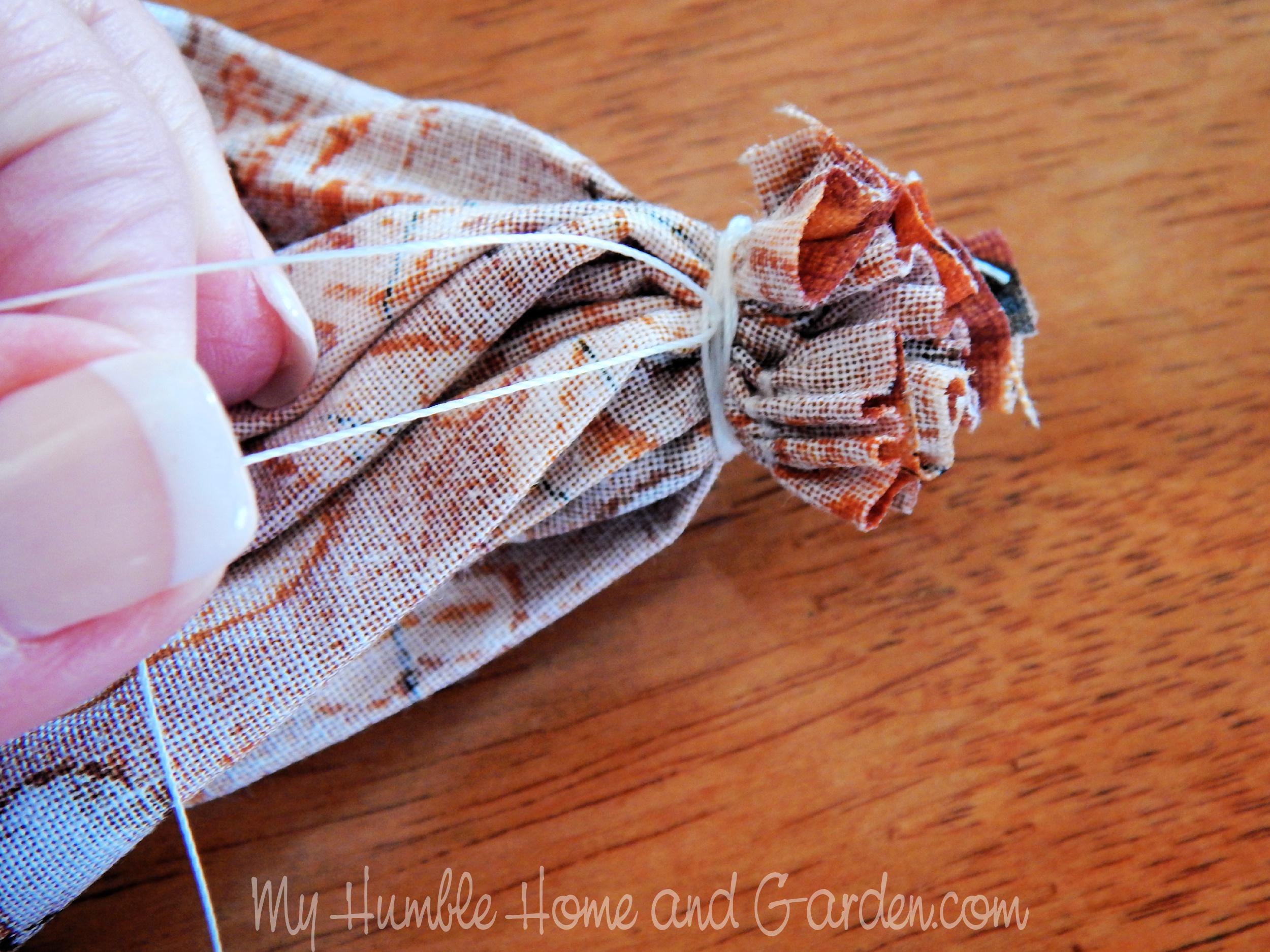 Wrap the thread around the gathers and tie. Posted on 2021-09-012021-09-01Full size 2500 × 1875 Wrap the thread around the gathers and tie. How To Easily Make Cute Little Fabric Pumpkins