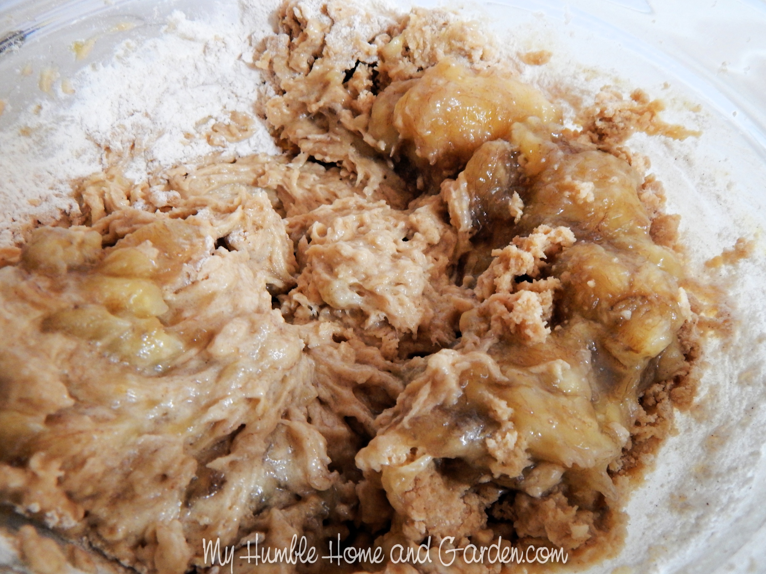 Add flour mixture and bananas to the shortening, sugar, egg, and vanilla mixture. Blend just until combined.
