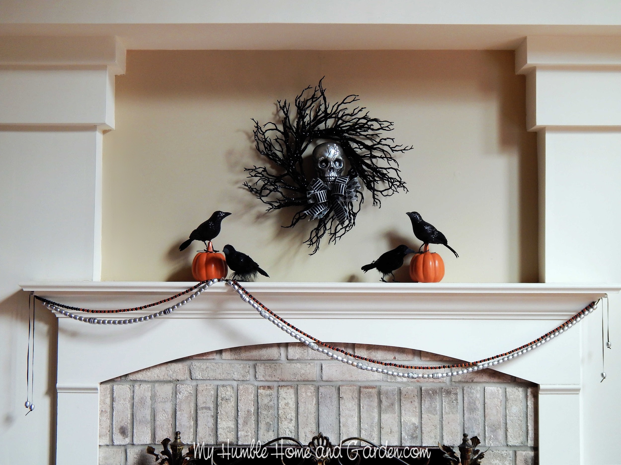 How To Decorate A Classy Fireplace Mantel For Halloween – Place black crows on and beside the pumpkins. #halloweendecor #halloweenmantel #crows