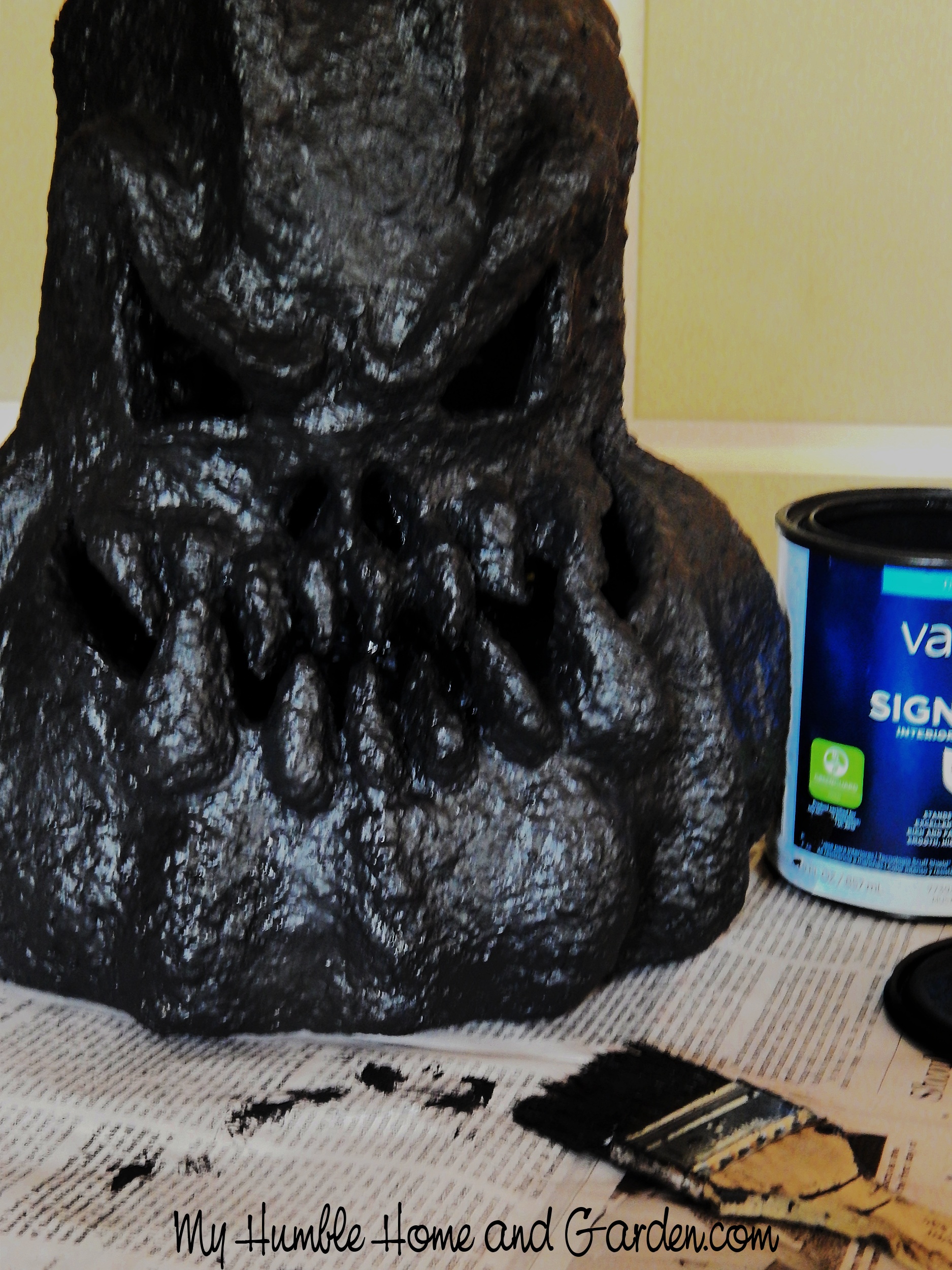 How To Make A Frightening Jack O’ Lantern Out Of Paper-Mache – Part 3 – Paint with flat black paint. #pumpkin #papermachepumpkin #paintedpumpkin