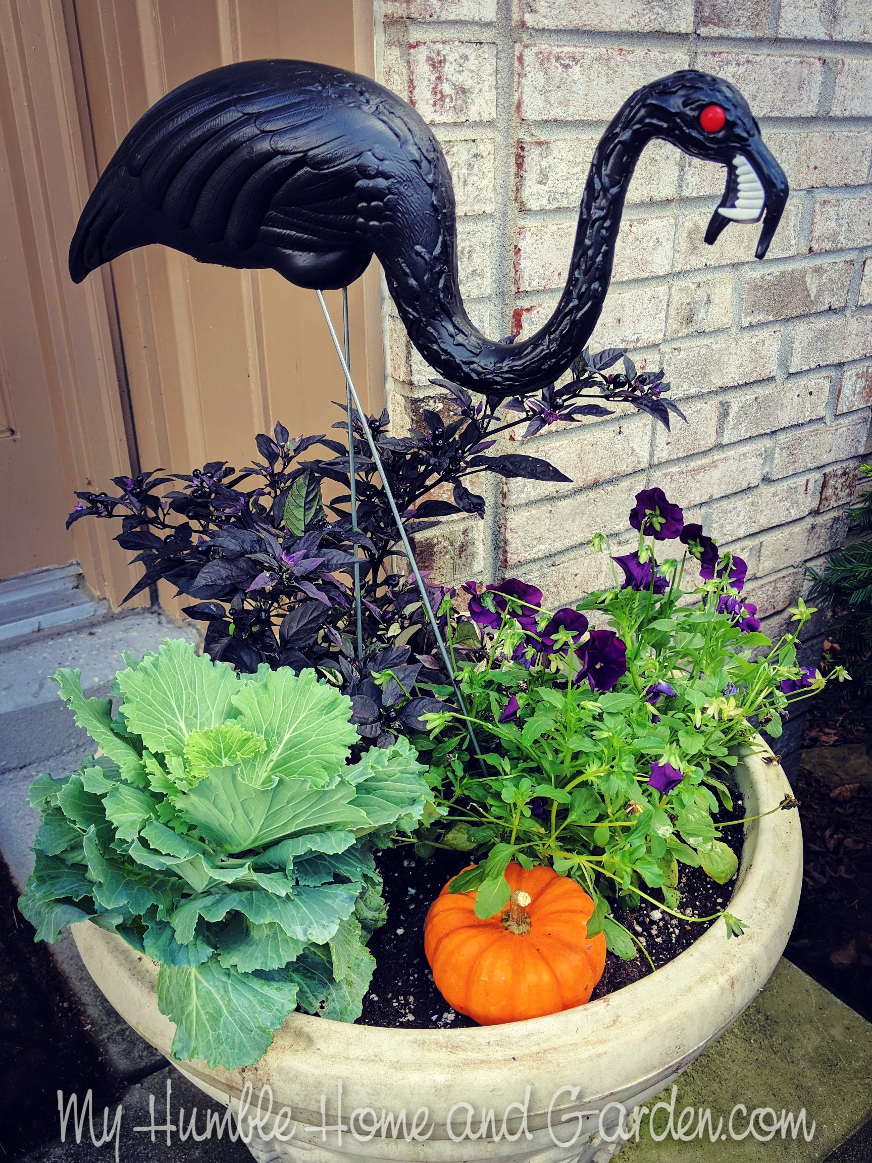 These zombie flamingos are from Cyndi’s Garden Center. at 3399 Lawrenceburg, North Bend, Ohio. The plants and pumpkins are from there, too. Everyone around has mums but how about this unique combination? In the back is Purple Flash, an ornamental pepper. It grows about 15 – inches tall. Doesn’t it look great with the flamingos?