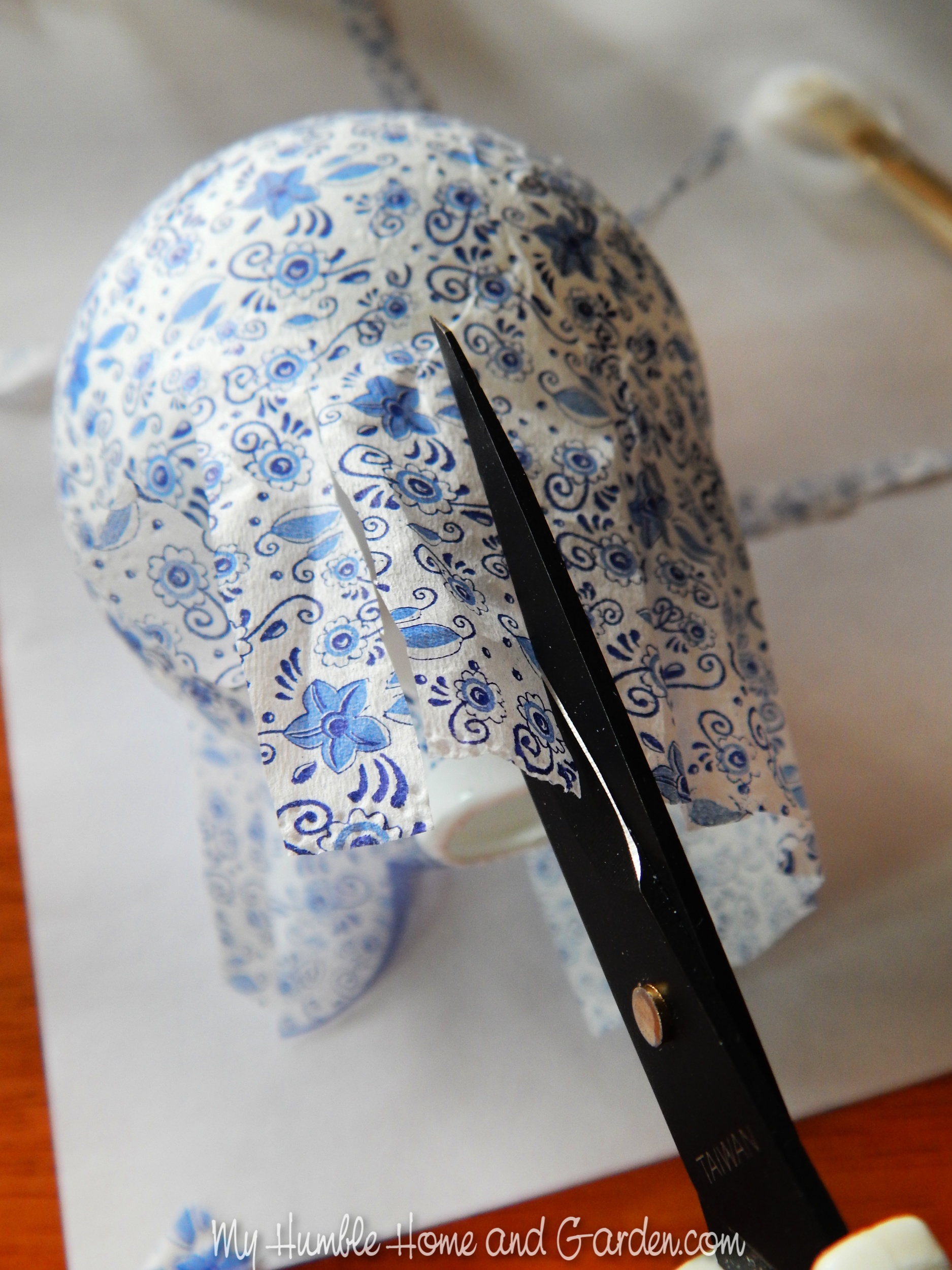 Turn the ornament over and begin making cuts from the bottom side of the ornament. You’ll want to cut away some of the napkin along the edges of the cuts you make. I try to have very little overlap. You don’t want too much bulk in one spot.