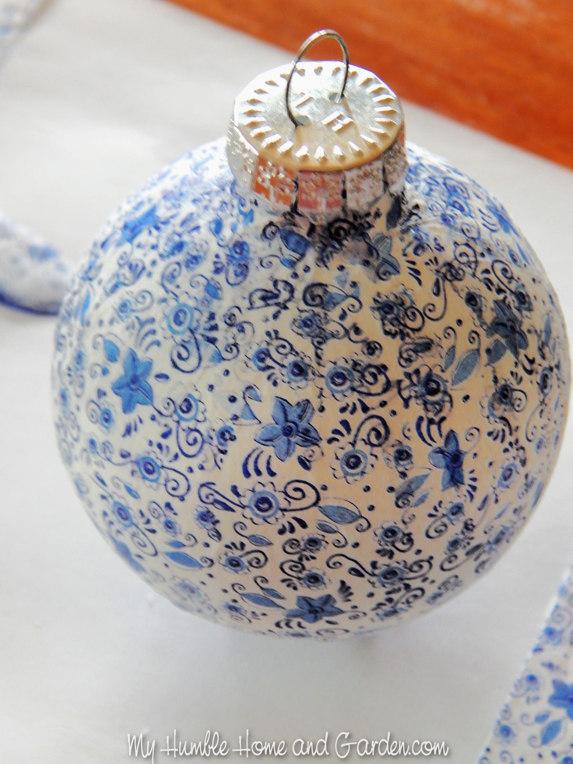 The ornaments that I am using are 2.64″ in diameter. I found these at Hobby Lobby. Remember when you are buying the ornaments that you will want a smooth surface. These are shiny white glass, and they work perfectly. The white background of the napkin is barely visible once it has been glued to the ornament.