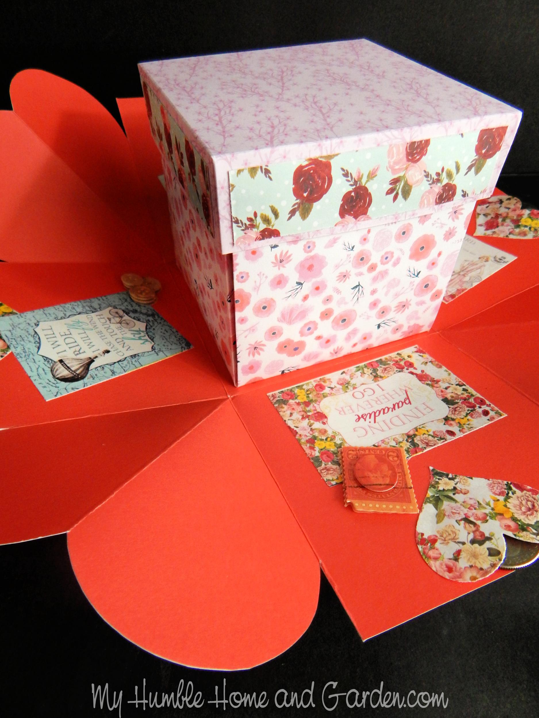 You can fill your exploding box with candy, little gifts, pictures, cards, envelopes, money, or whatever you like.