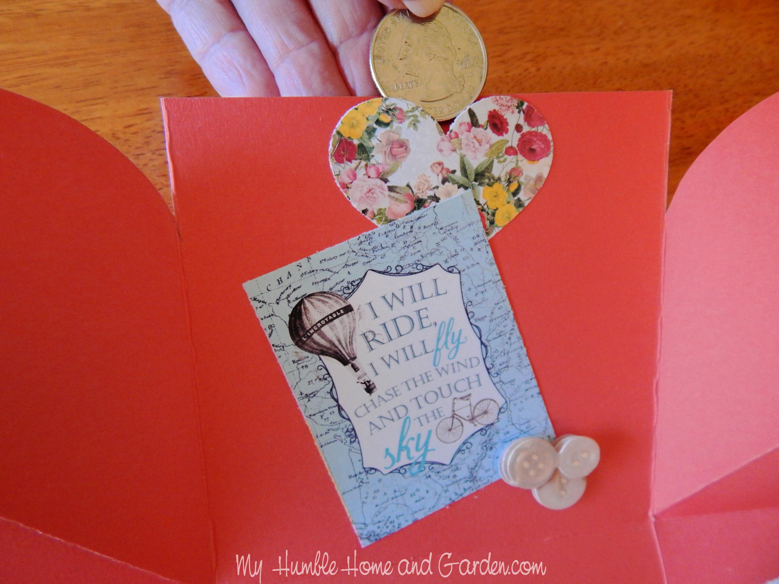 The sides of the boxes weren’t falling down dramatically enough. After considering different options, the idea to use a heart cutout to hold a quarter at the top of each flap came to mind. We have hearts in the corners. Repeating with more paper hearts seems appropriate.