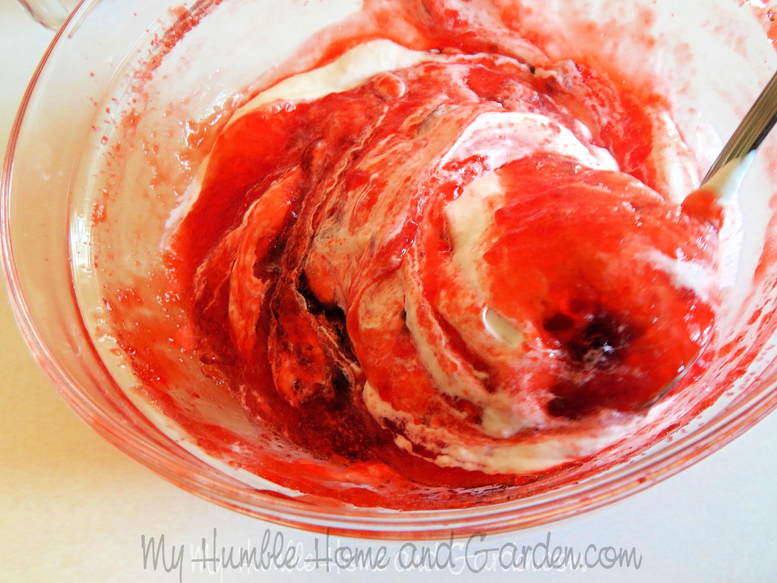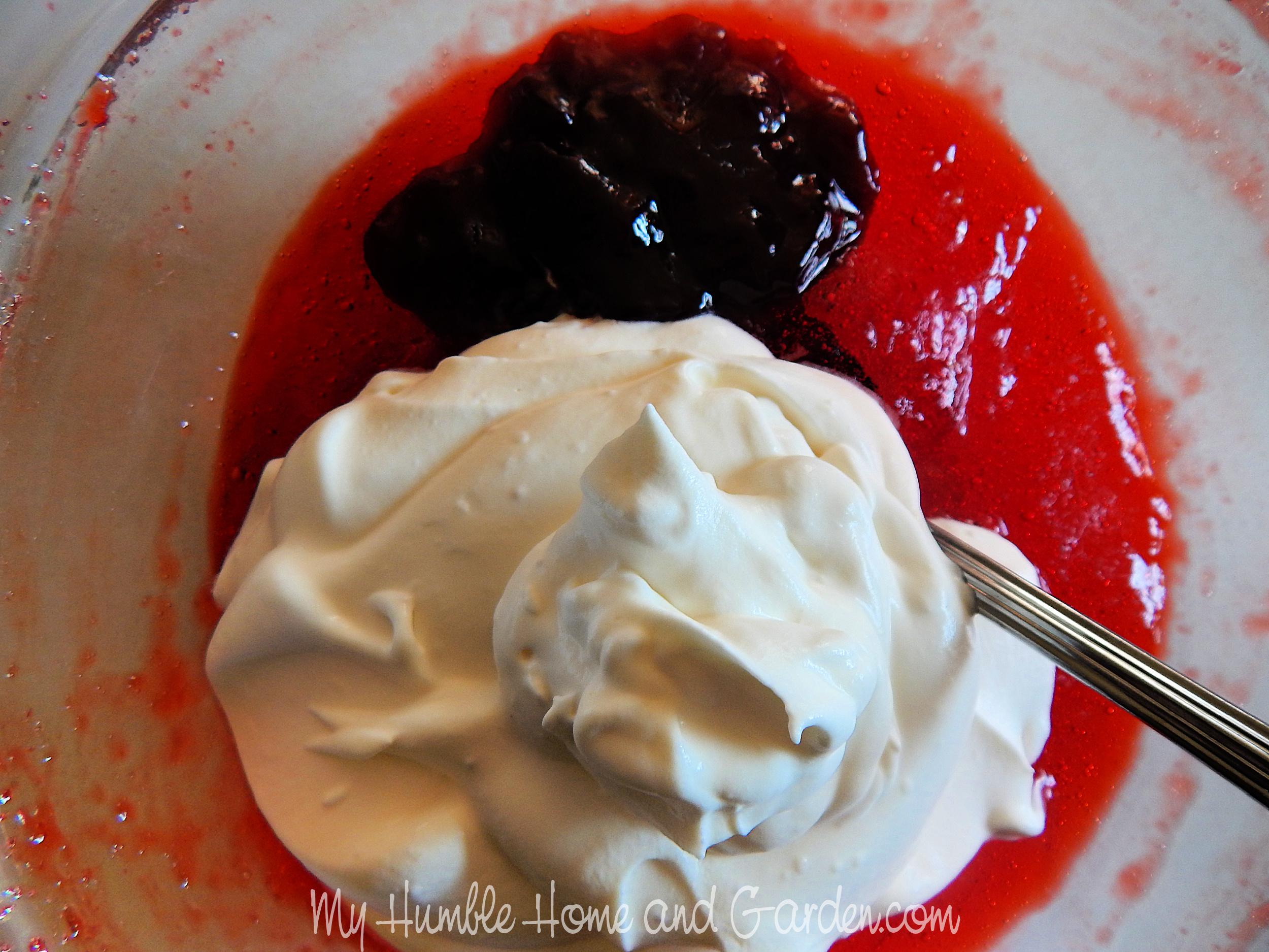 Fold the raspberry jam and the whipped cream into the remaining gelatin.