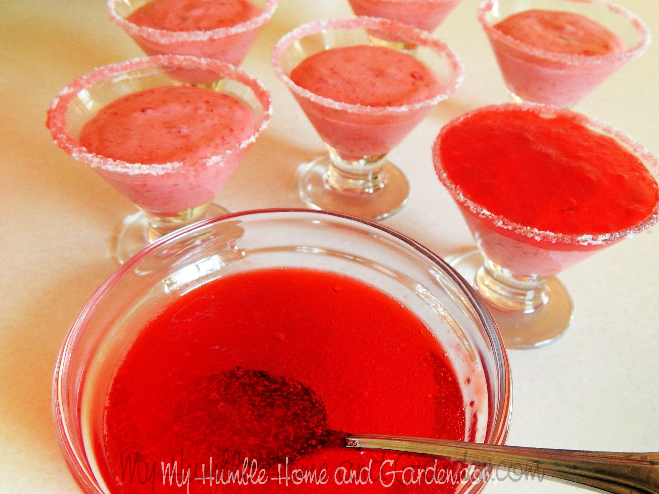 Next, dip just the rims of 8 mini-dessert glasses in the dissolved gelatin. Then, dip each into sugar. Set aside and allow the gelatin to dry. The white sugar will be pink after absorbing some of the red from the JELL-O.