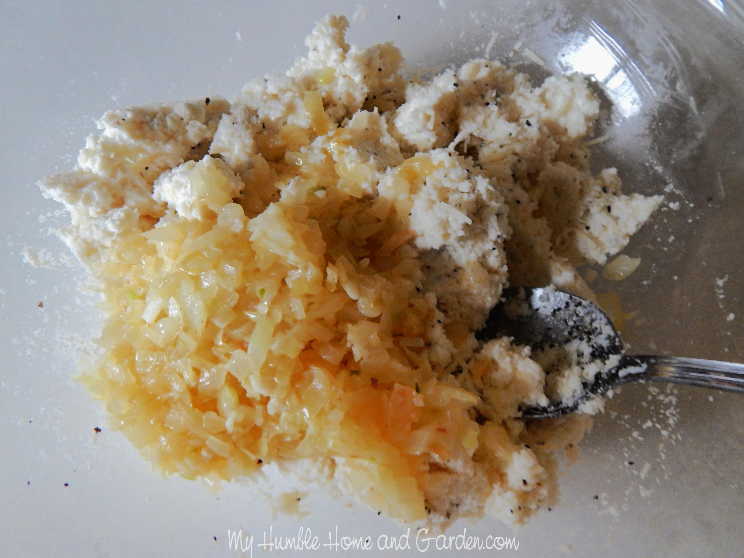 In a large bowl, mix the ricotta, grated cheese, salt, and pepper. Then, mix in the sauteed onions and garlic mixture.