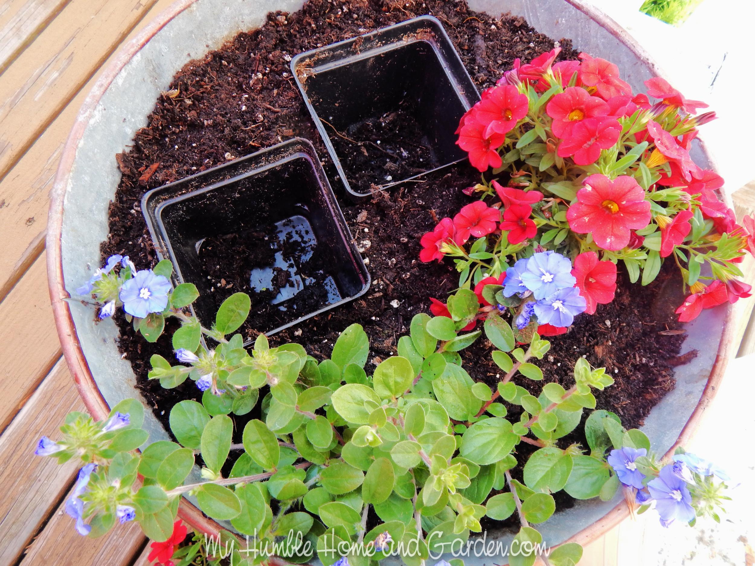 How To Plant Flower Containers Easily Using These Brilliant Tips – drop the blue flowers into an empty well. #springflowers #pottingflowers