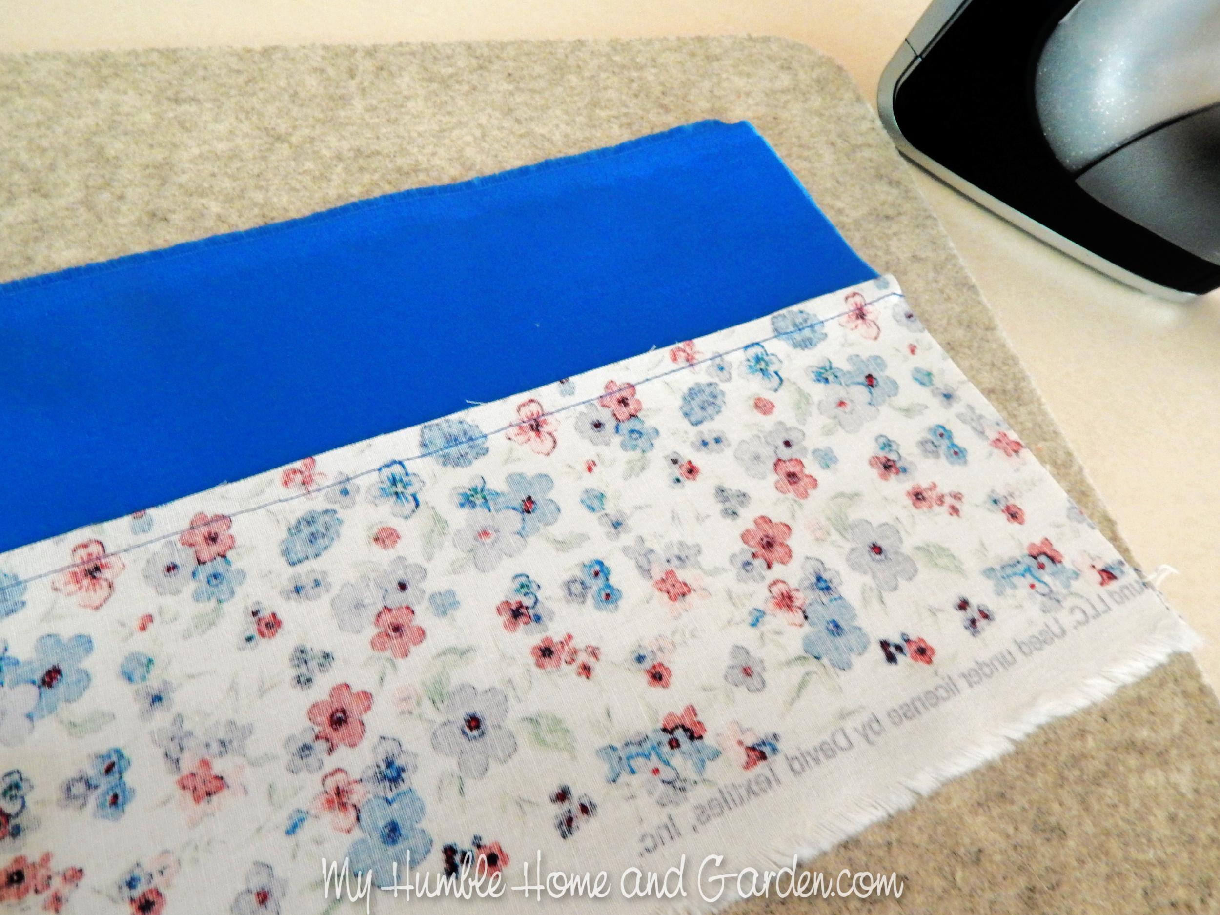 Edgestitch around the fabric square. Start stitching at one of the seams where the two fabrics are pieced together. Backstitch when beginning and ending stitching. Trim the threads.