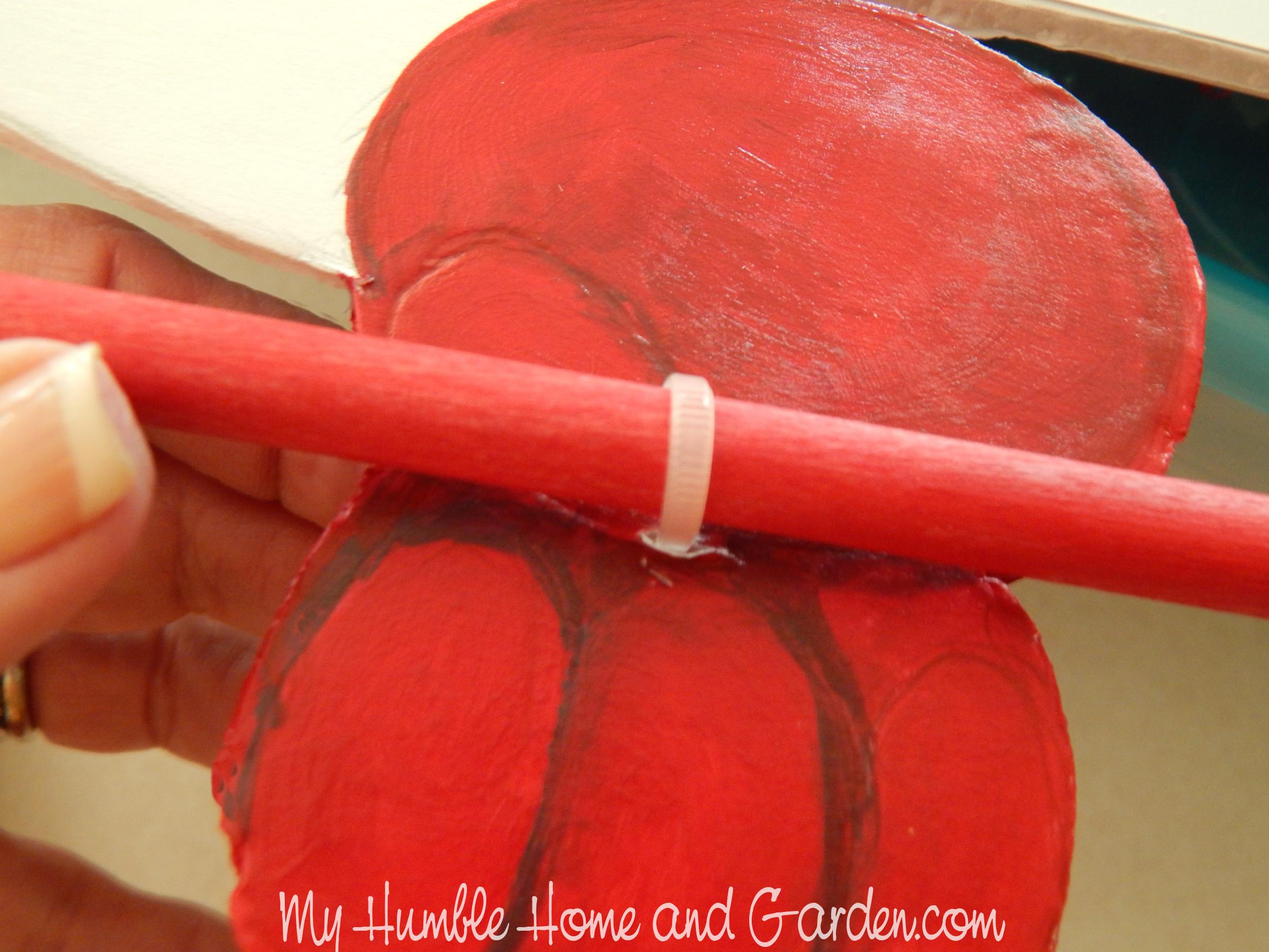 First, paint the wooden dowel with the fire-red acrylic paint. Then, using the face heart template, cut 2 hearts from red cardstock. Glue the middle of the hearts to the end of the dowel. Then, glue the outside edges together.