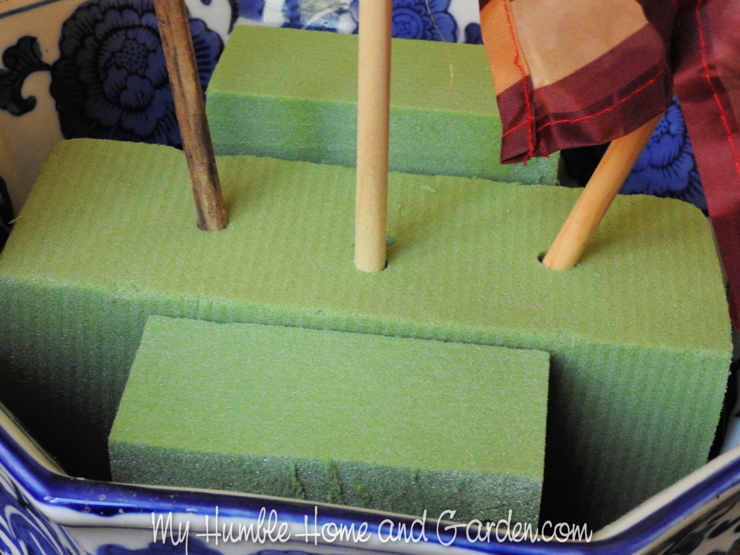 You can see that we’ve visually created two triangles, which is a good thing! We need something more substantial in the bowl… Three vintage looking American flags are the perfect addition. First, we use some dry floral foam to create a good base for the wooden dowels holding the flags.
