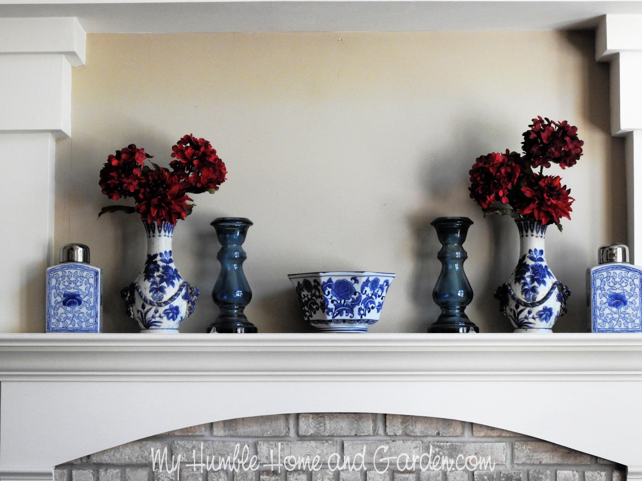 How To Create a Red, White, and Blue Patriotic Mantel Display? Blue and White Chinoiserie pieces with red silk flowers. #patrioticdisplay #redwhiteandblue #4thofjuly