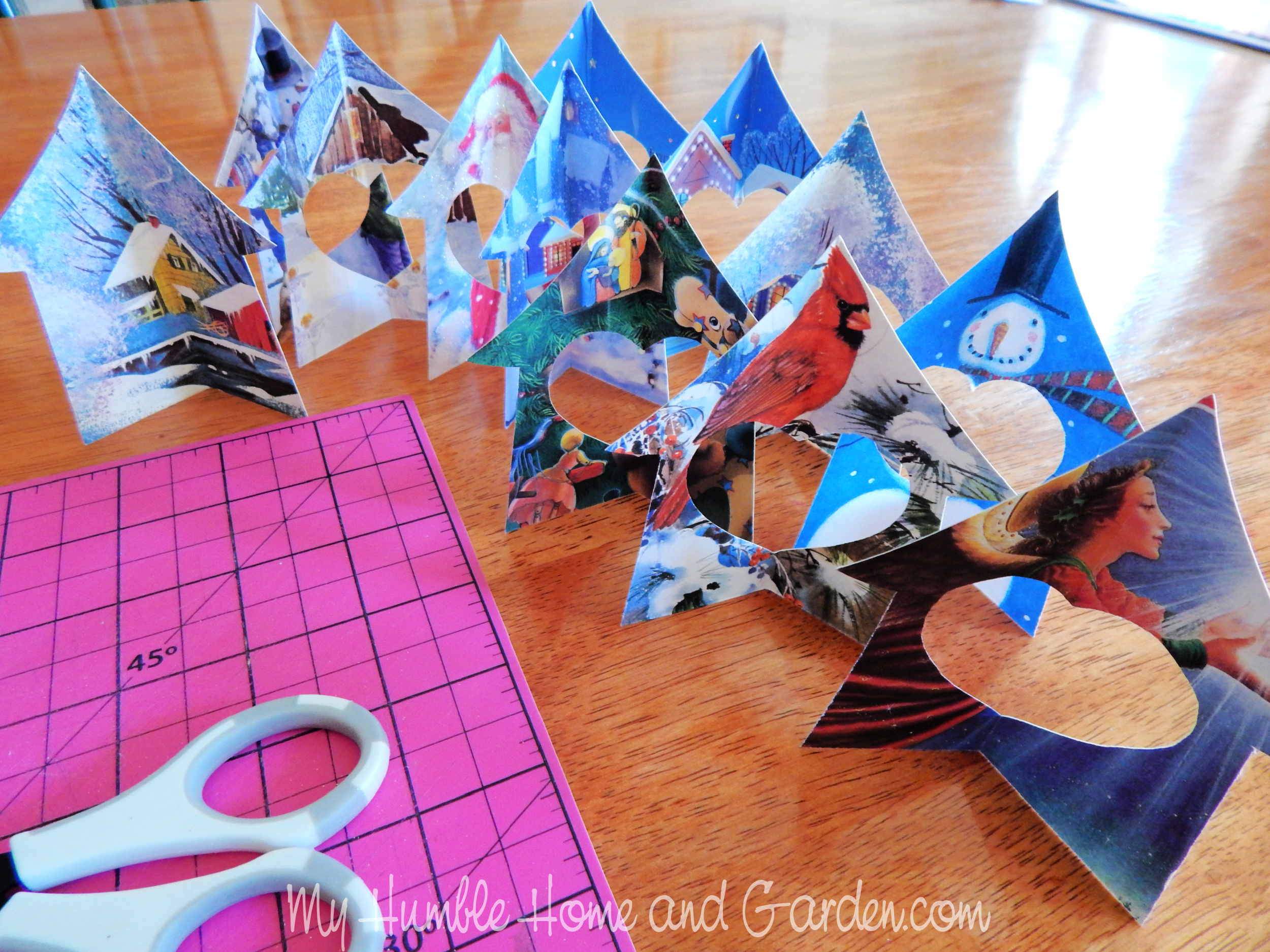 First, you need to go through your Christmas cards and find 12 cards that look good together. A good way to do this is by choosing cards that have a common color or common colors. The other thing you want to consider is the depth of color. If you choose pastels, you don’t want to throw in a couple of vibrant-colored cards in with the mix. Choose cards with the same depth of color.