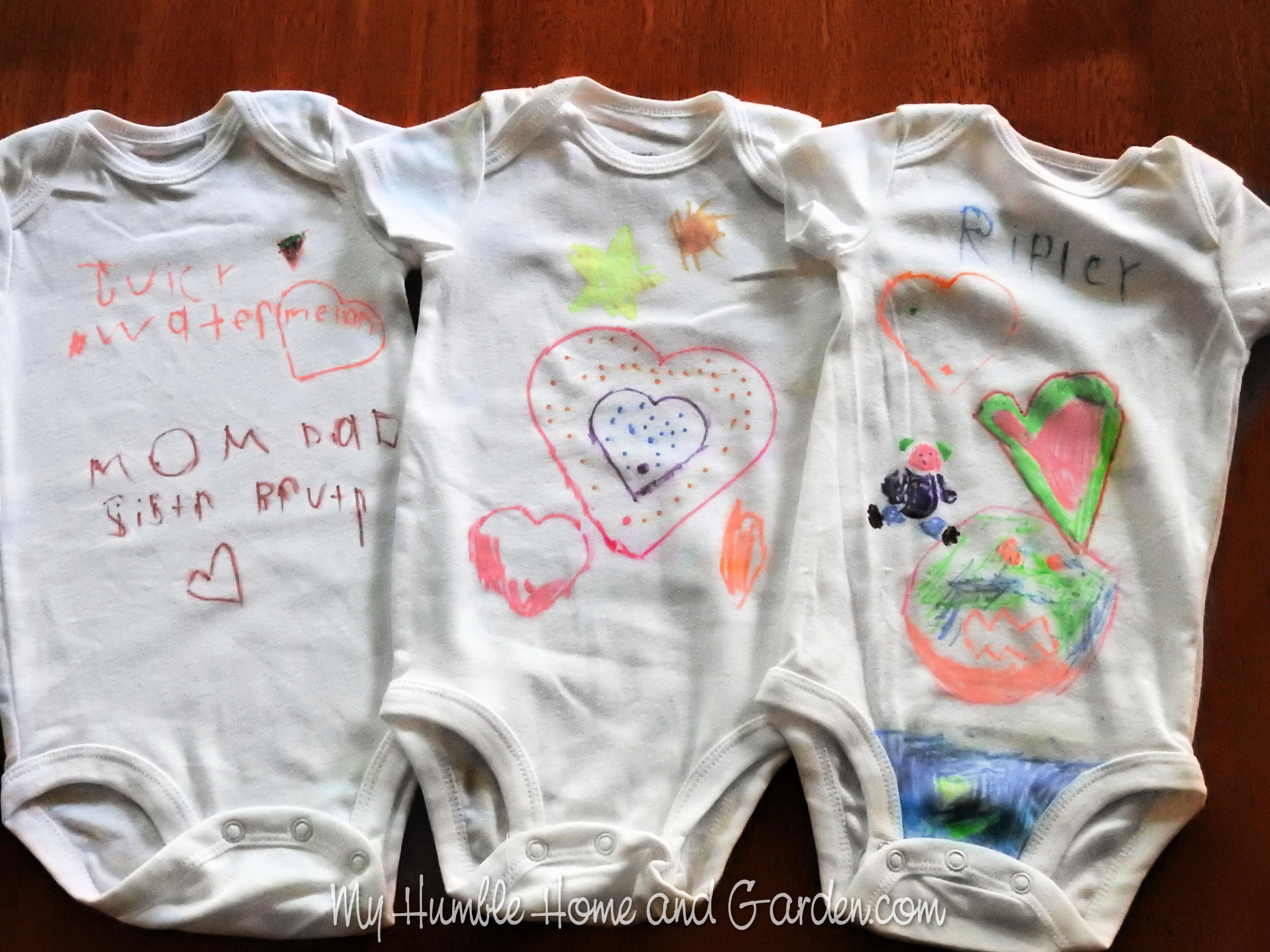 For this activity, you will need permanent-colored fabric markers and onesies. I bought two packs of these fabric markers and three different sizes of Gerber onesies, newborn, 3 – month, and 6 – month sizes.