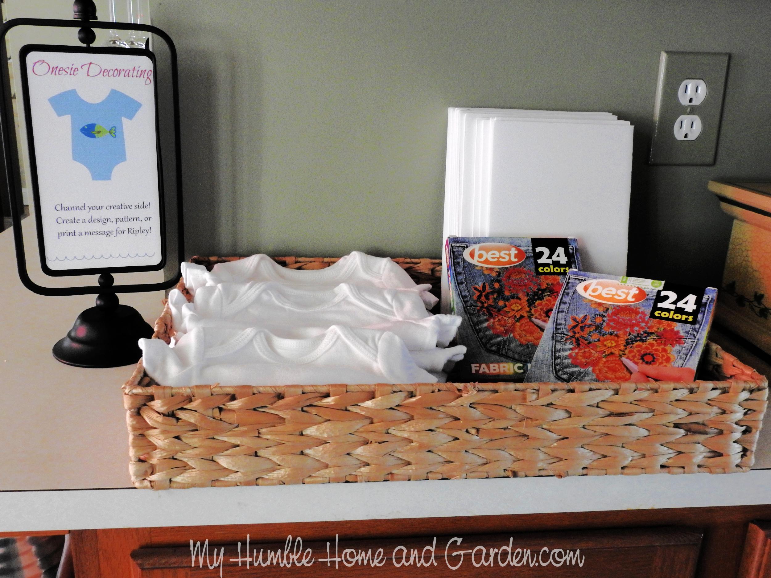Onesie Decorating Setup – How to Plan a Fishing Themed Baby Shower – Part 1 Activities. Baby shower activities instead of games. Late Night Diapers. #babyshower #babyshowergames