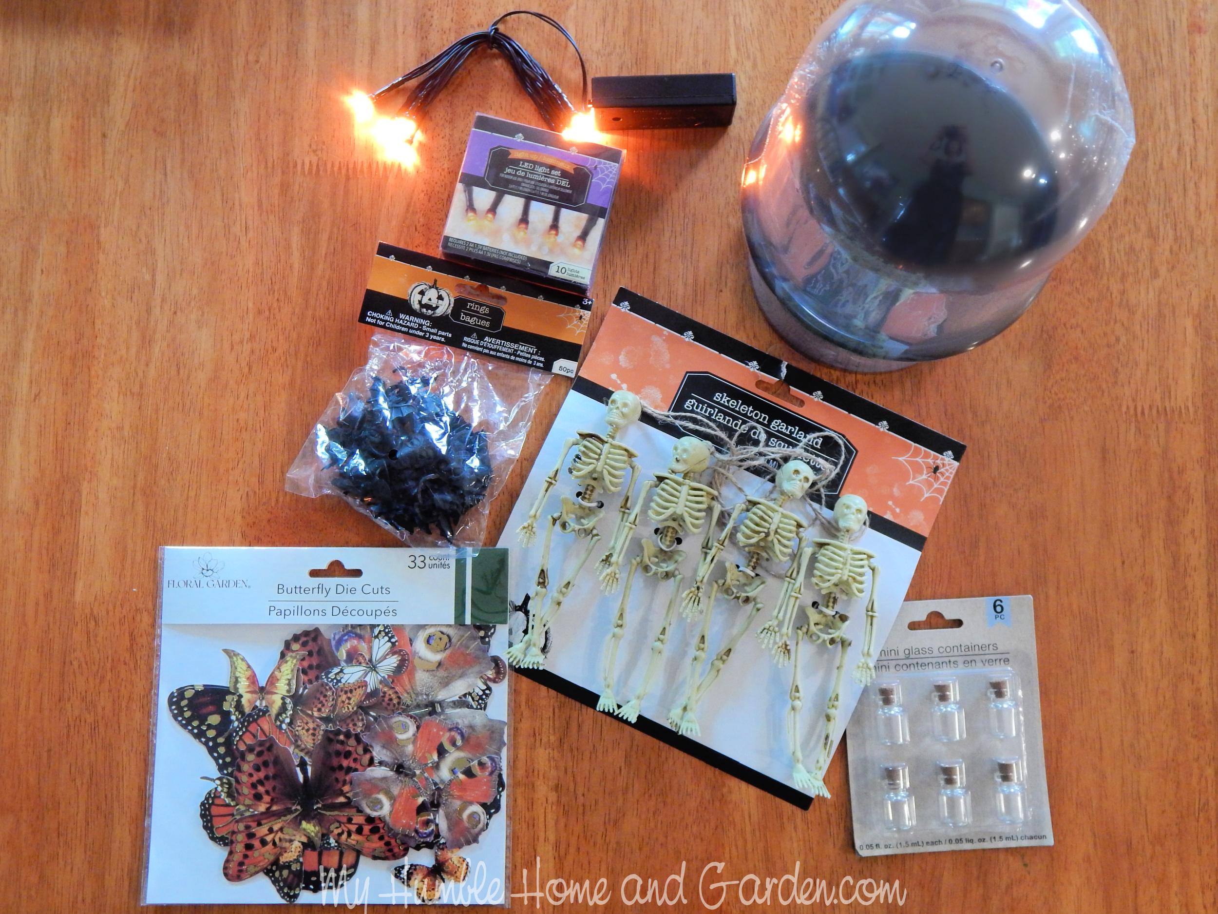 How to Create a Fairy Skeleton Bell Jar Display – Supplies for a fairy skeleton bell jar display. #fairyskeleton #skeletonfairy #halloweendecor