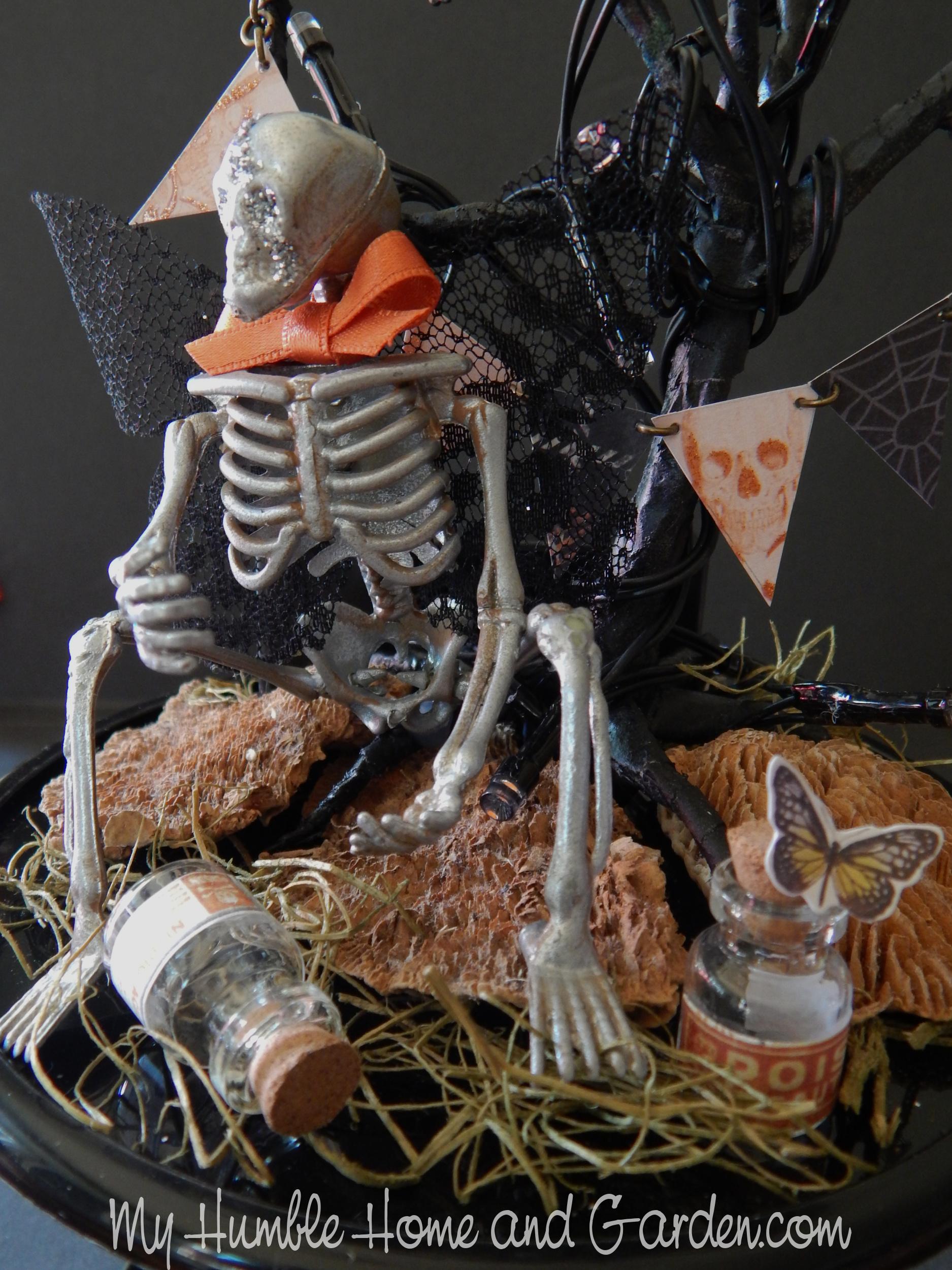 I tucked the dried tree fungus pieces around the tree roots. Use the glue gun to glue them in place. A little bit of glue on the skeleton’s bum holds him in place on the tree root. A drop of hot glue under each foot holds each in place.