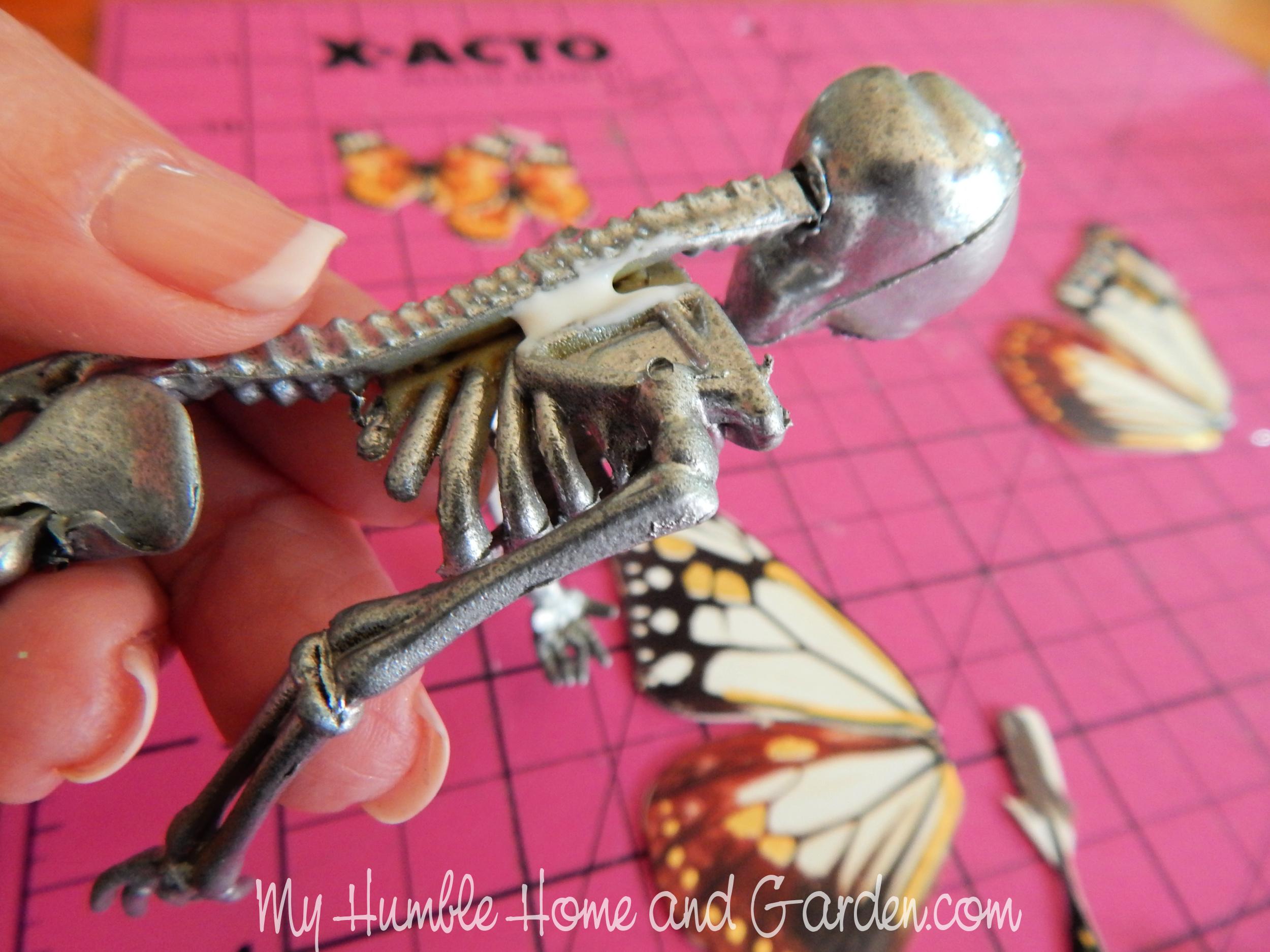 First, lay the skeleton on the wings and decide which you like the best. I chose two matching butterflies and glued them with Tacky Glue back-to-back.