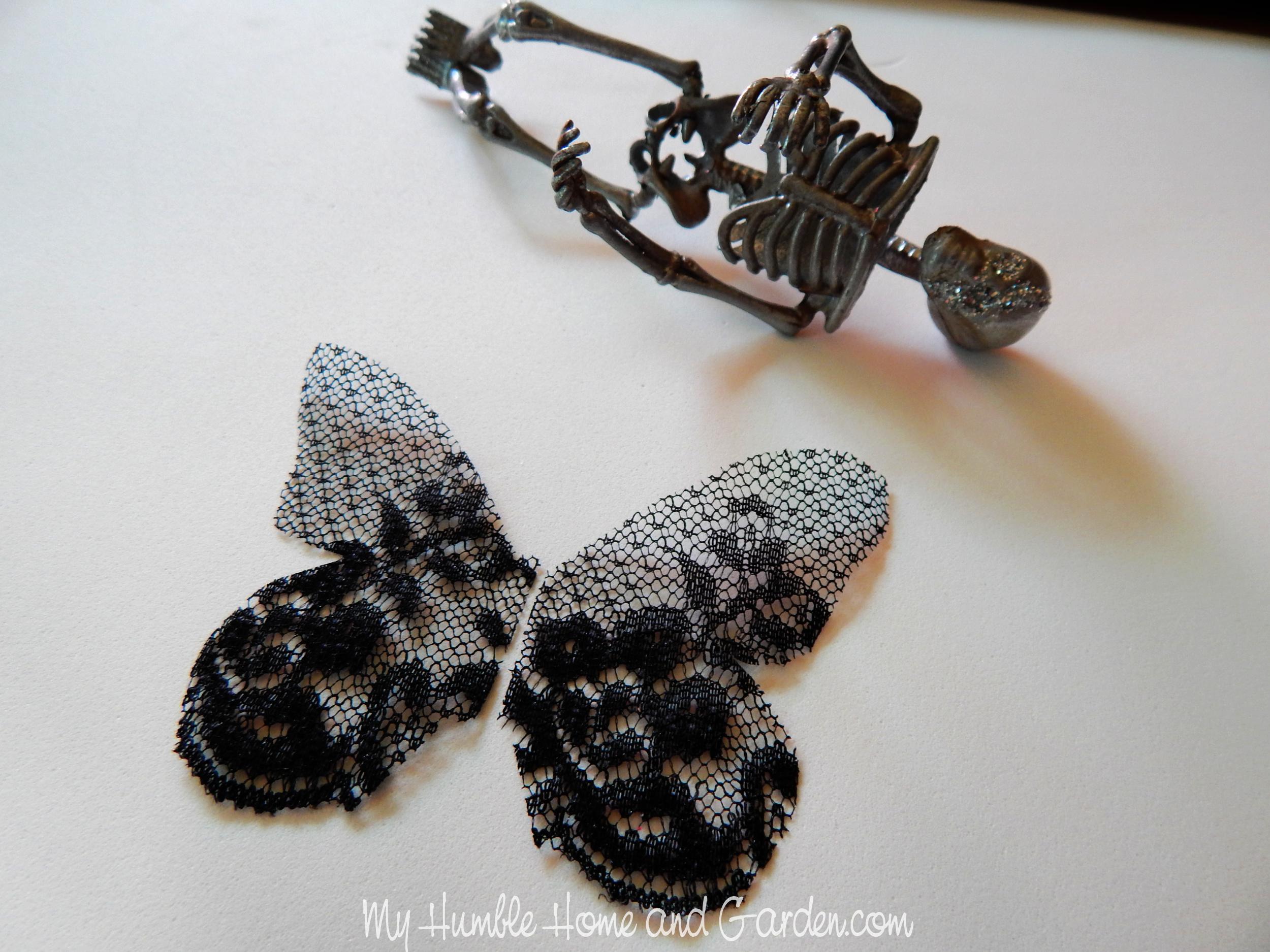 How to Create a Fairy Skeleton Bell Jar Display Part 2 – Cut the butterfly wings in half. #fairyskeleton #skeleton #lacebutterflywings