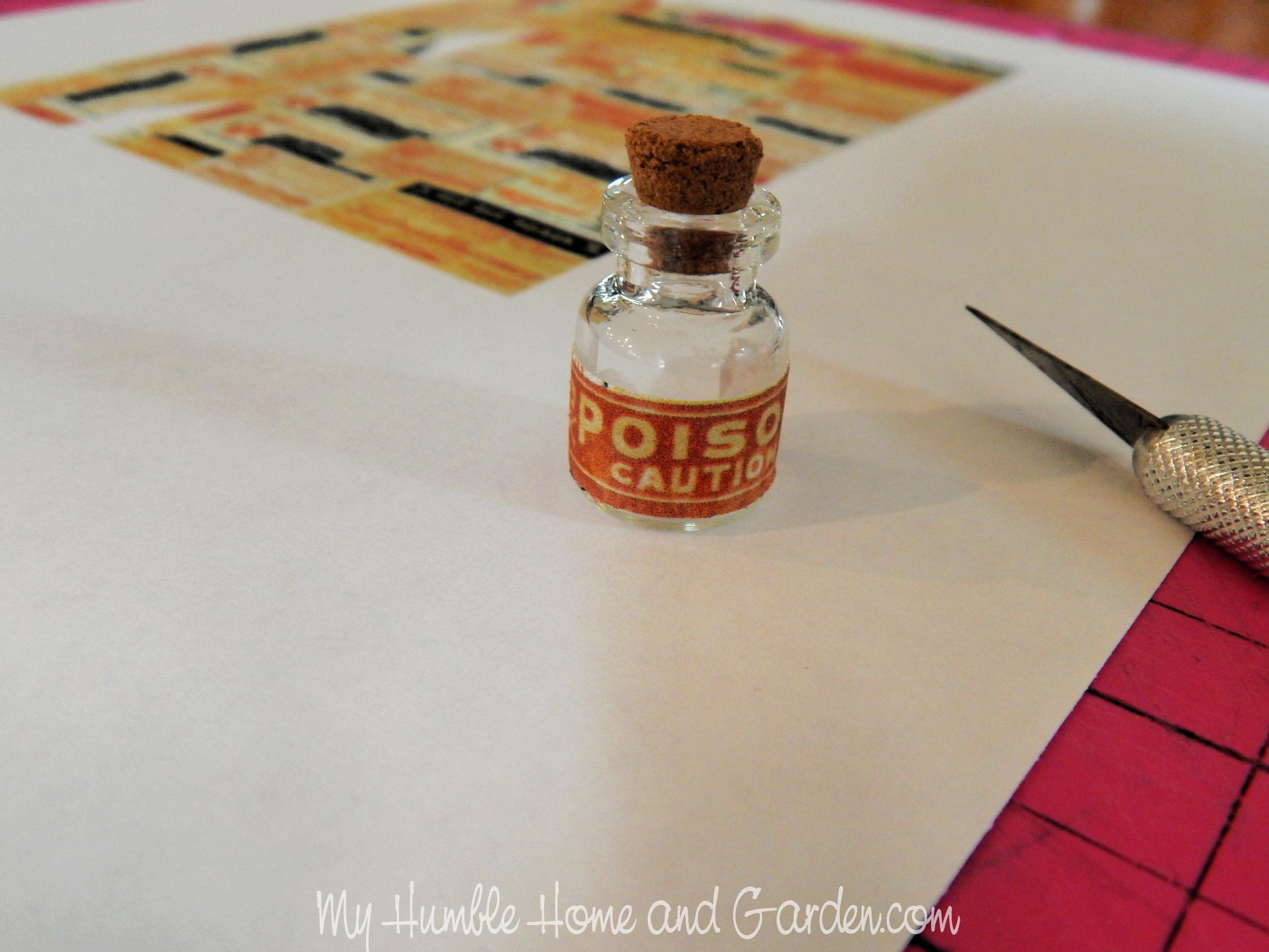 How to Create a Fairy Skeleton Bell Jar Display Part 2 – Glue the poison label to the bottle. #fairyskeletonbelljar #poisonlabel