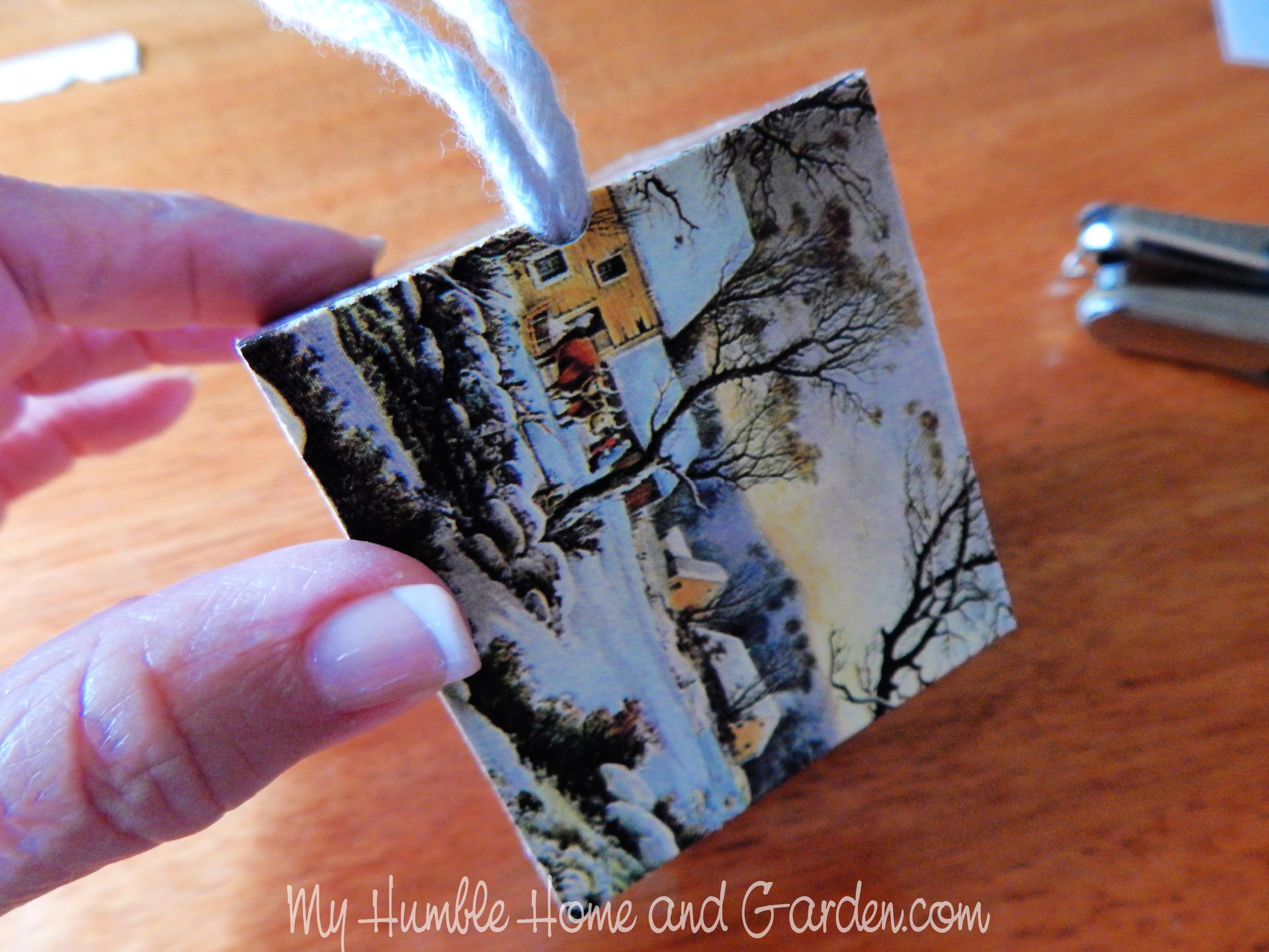 How to Recycle Christmas Cards to Make Ornaments – Apply glue to the back of the roof piece and thread the loop thru the punched hole.