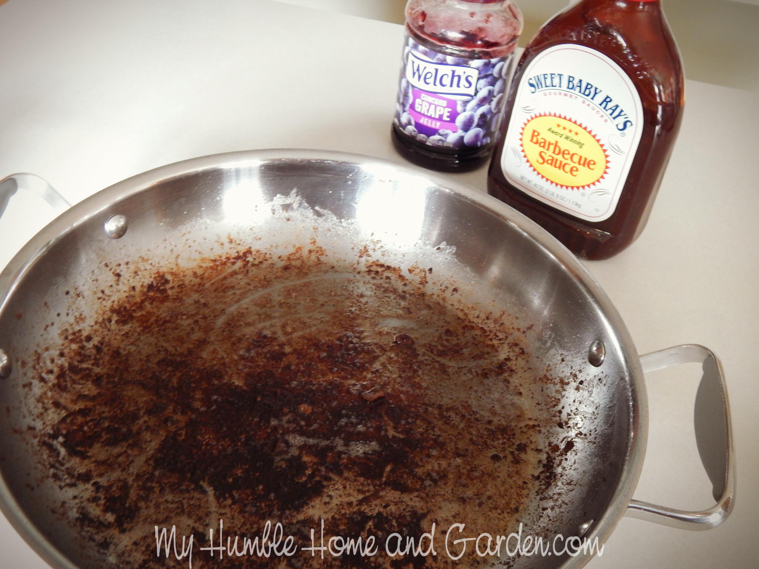 Easy Grape Jelly Meatballs – Recipe and How-To, Add equal parts grape jelly and barbecue sauce to fond in the pan. #meatballs #appetizers