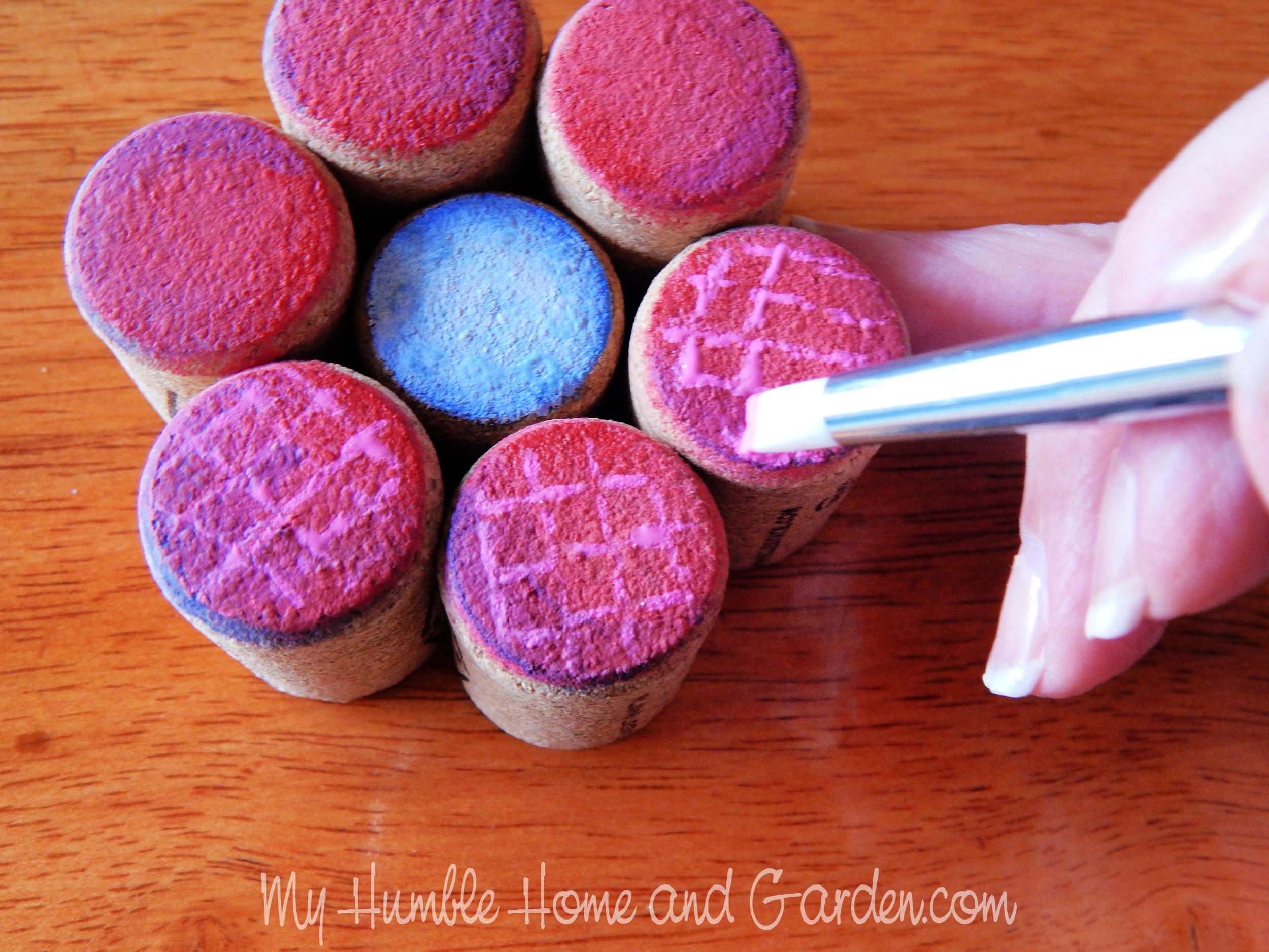 How to Make a Mary Engelbreit-Inspired Wine Cork Wreath – Use the foam end of a mandala tool to create pattern. #winecork #winecorkflowers #upcycledwinecorks