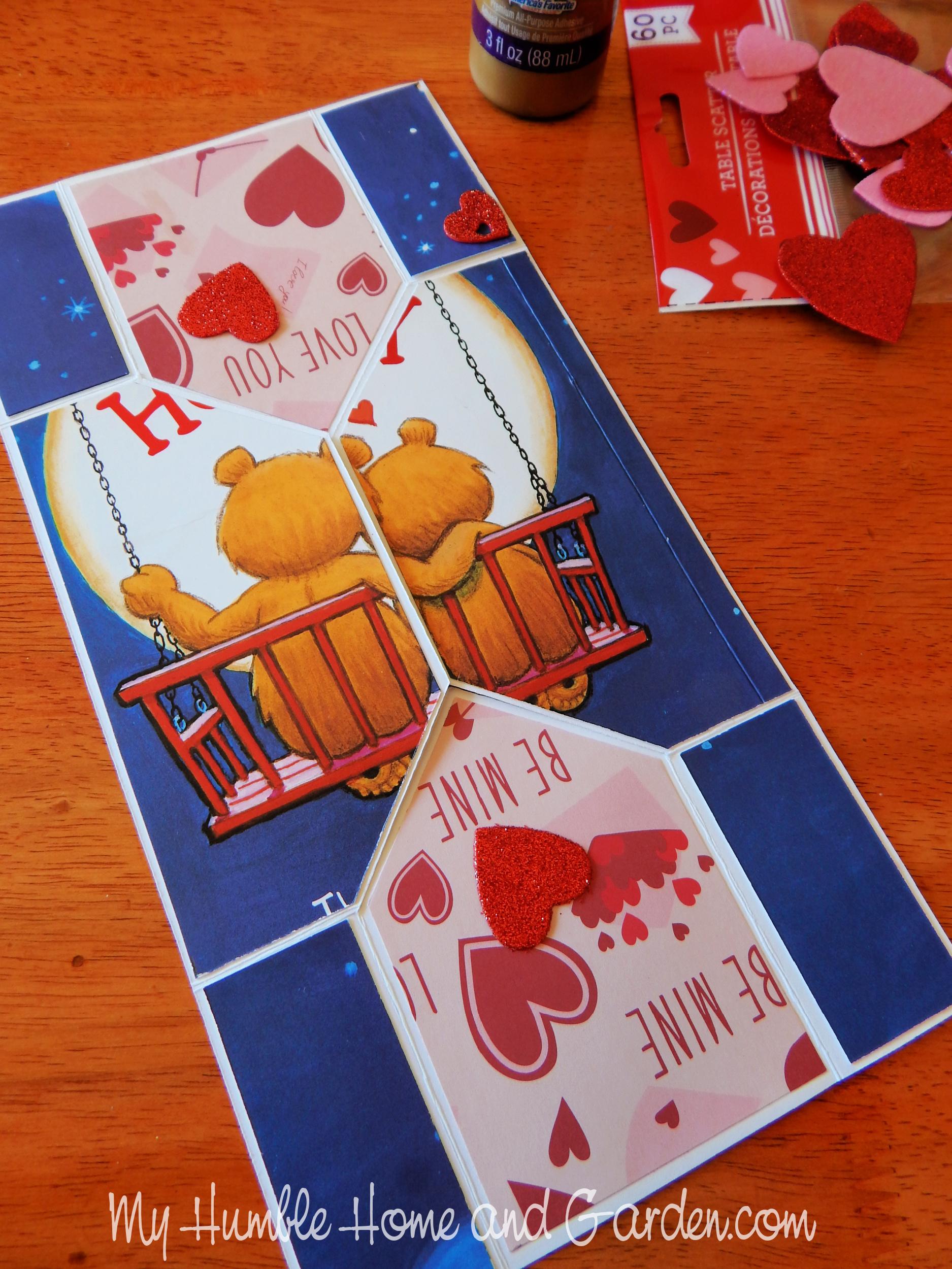 Once the card is opened, you will see the rest of the cut-out card or cardstock on the flaps. You can see a few glittery hearts add a little interest to the flaps. You can totally get creative here.