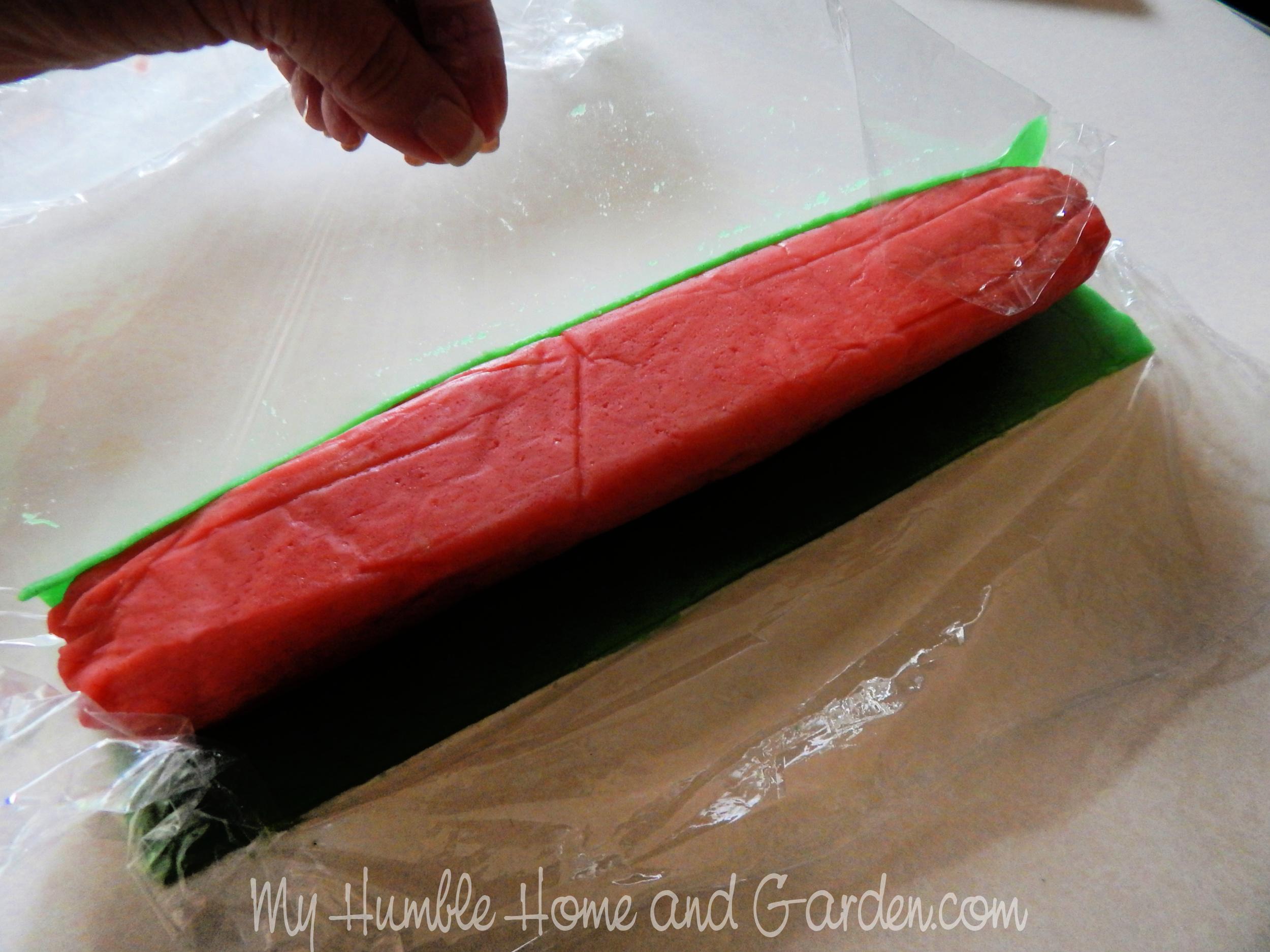 How to Make Watermelon Slice and Bake Sugar Cookies – Pull up the plastic to wrap the green dough. #watermeloncookies #sliceandbakecookies