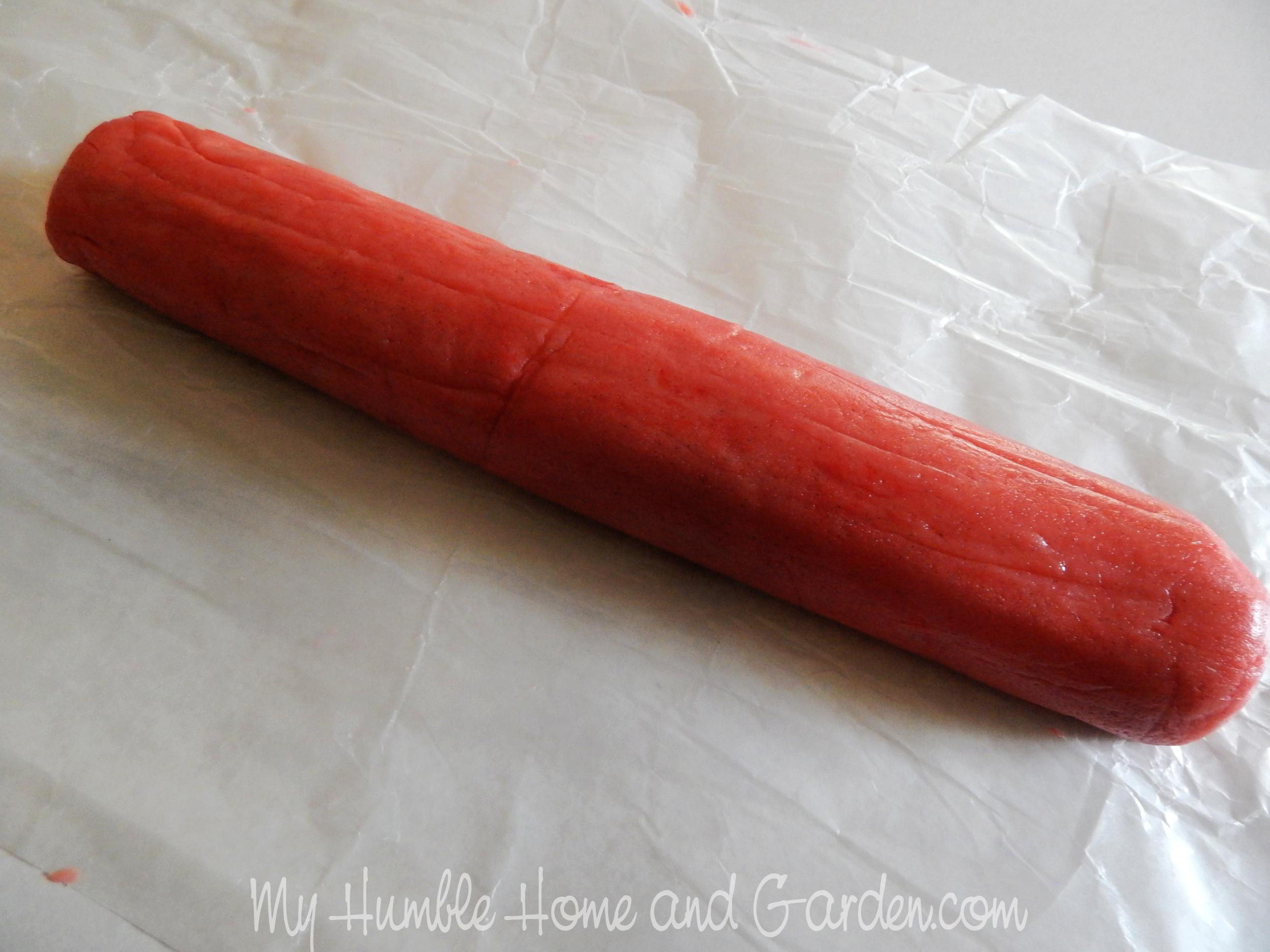 How to Make Watermelon Slice and Bake Sugar Cookies – Use wax paper to roll into a log. #sliceandbakecookies #watermeloncookies