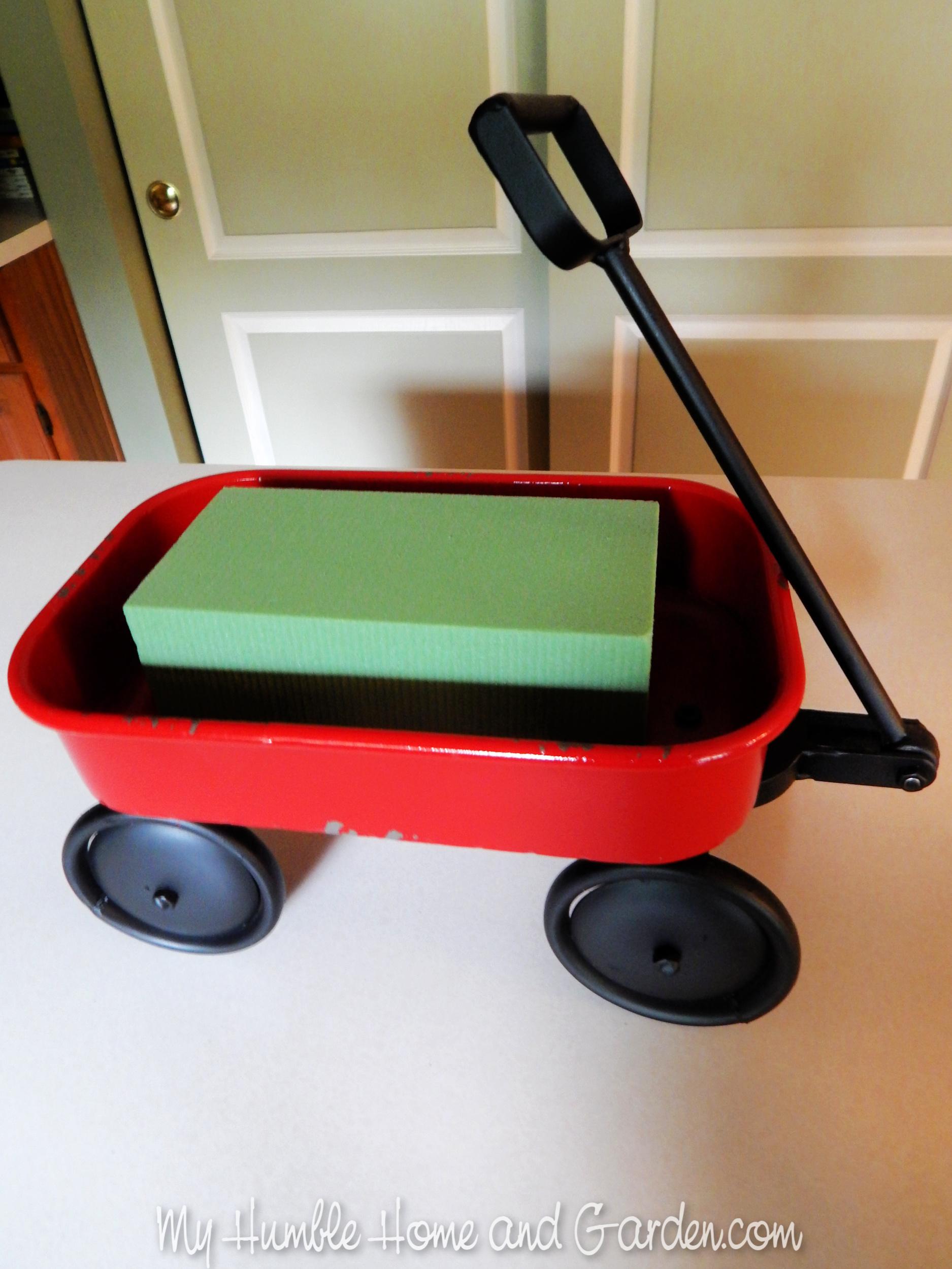 Then, place the green floral foam block in the little red wagon. You can secure the floral foam with floral tape, but frankly, I didn’t bother.