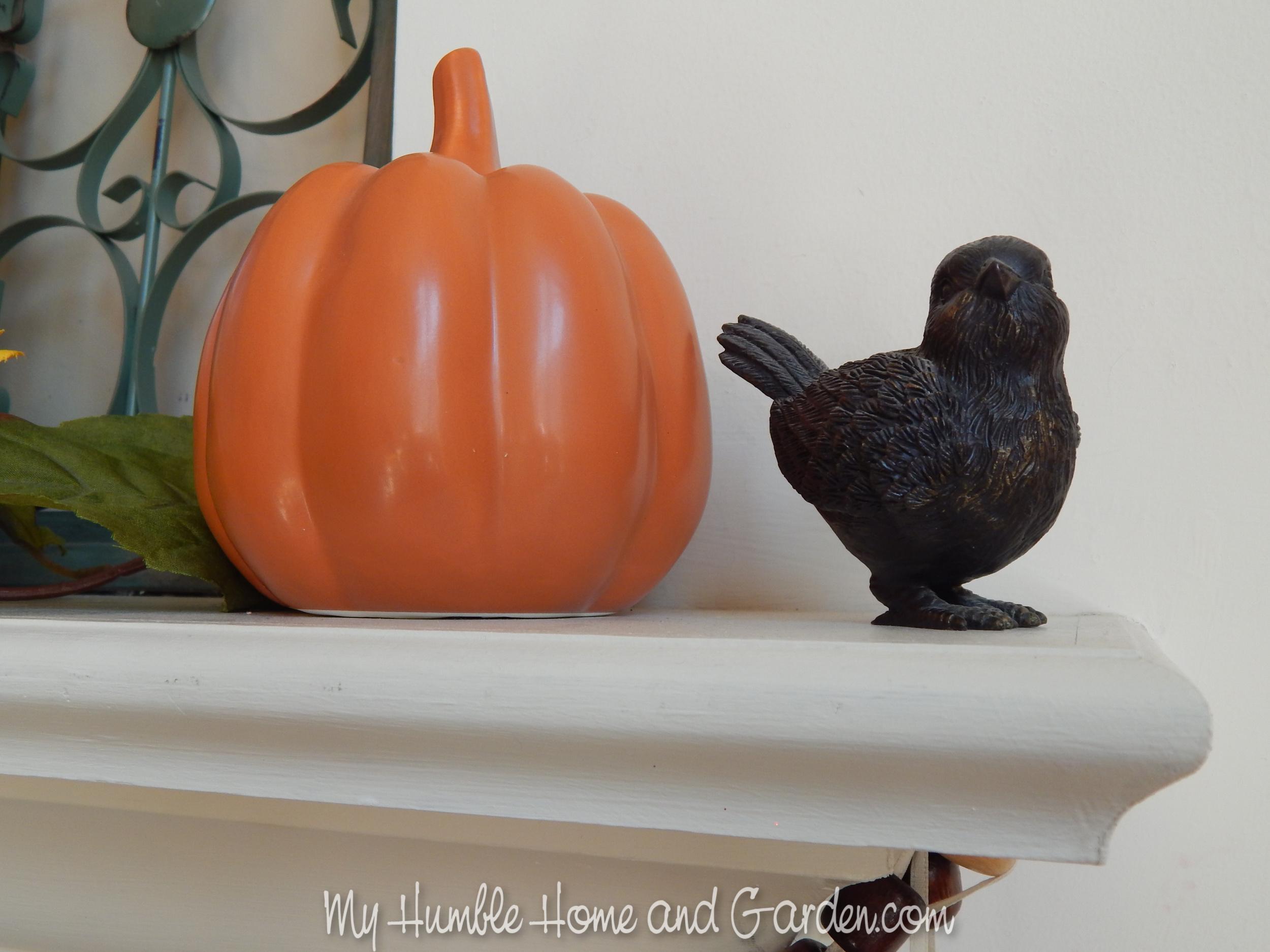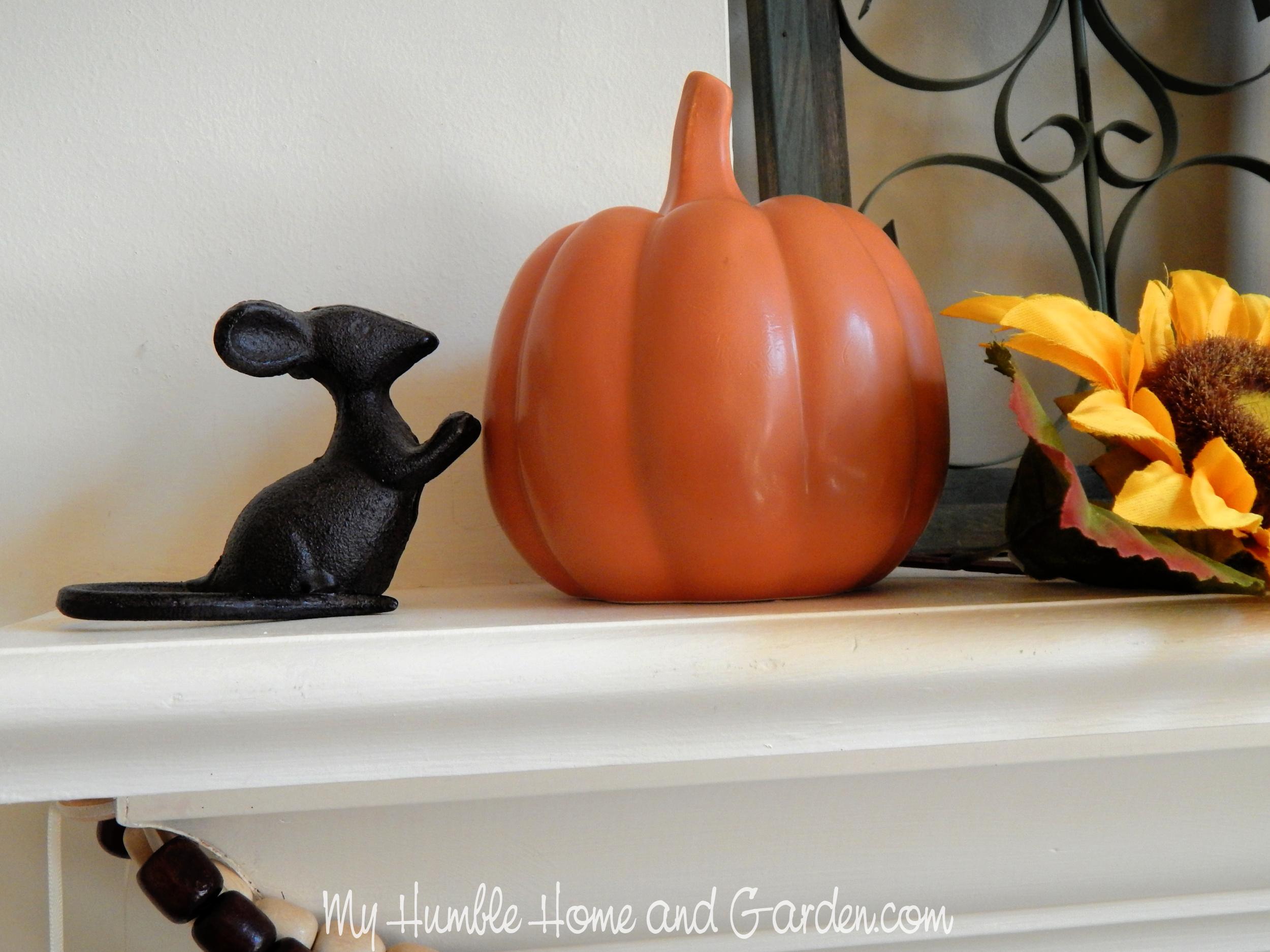 To pull the color of the sign down to the mantel, two ceramic pumpkins are set on the outside of the decorative arches.
