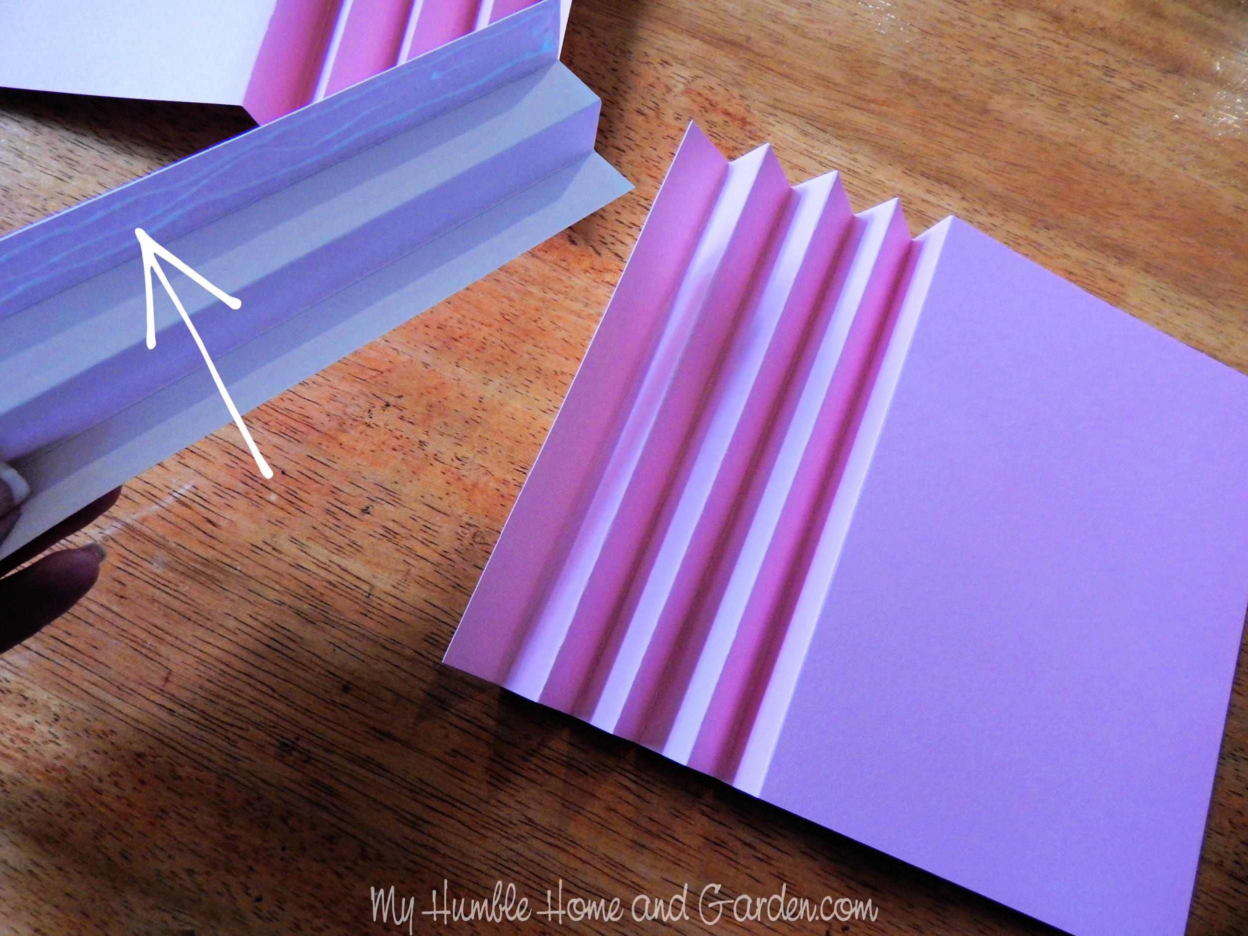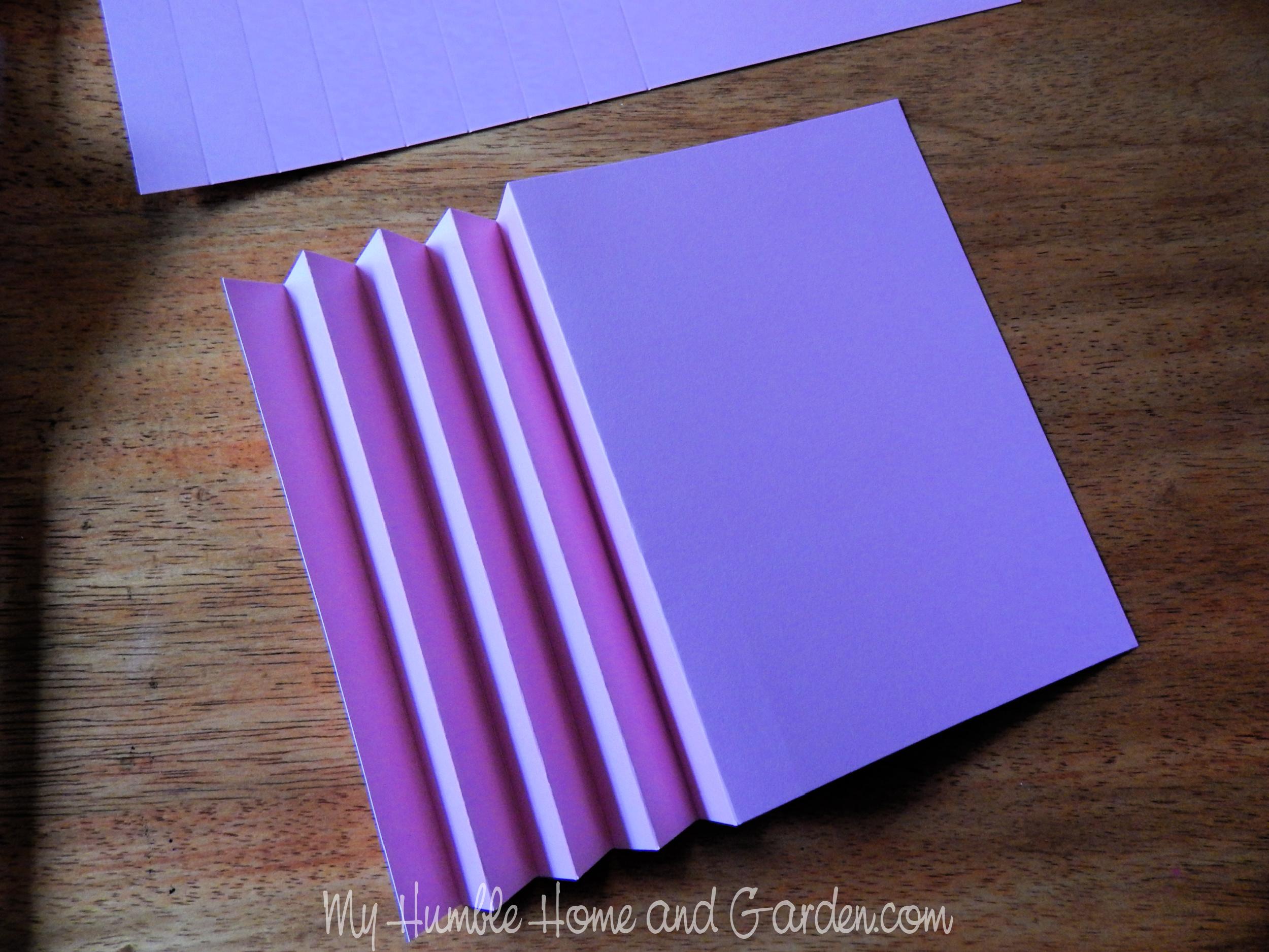 Then, with the fold facing away from you, fold and crease the second fold. Continue folding the creased lines accordion style. You should have 3 peaks and 4 valleys. Repeat on the remaining cardstock.