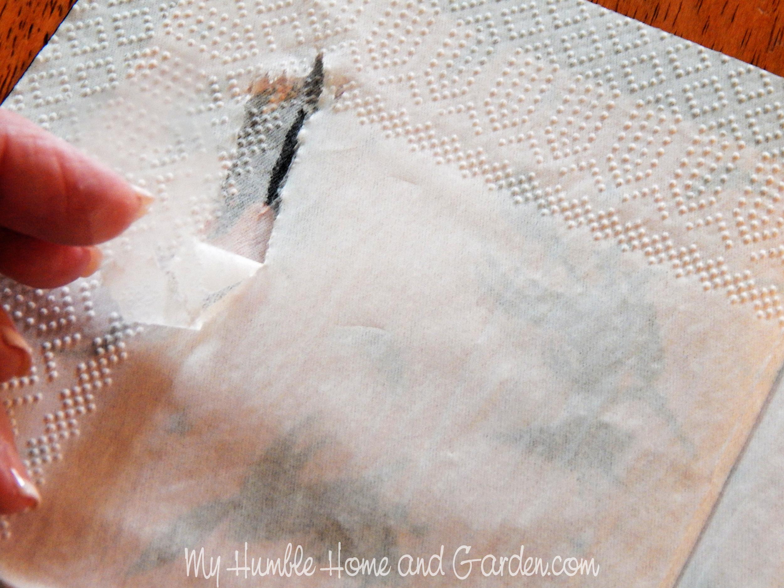 How to Make a Paper Napkin Transfer Wine Glass Shade – Use tape to help peel off the plain white layers. #papernapkintransfer #Wineglassshade #halloween