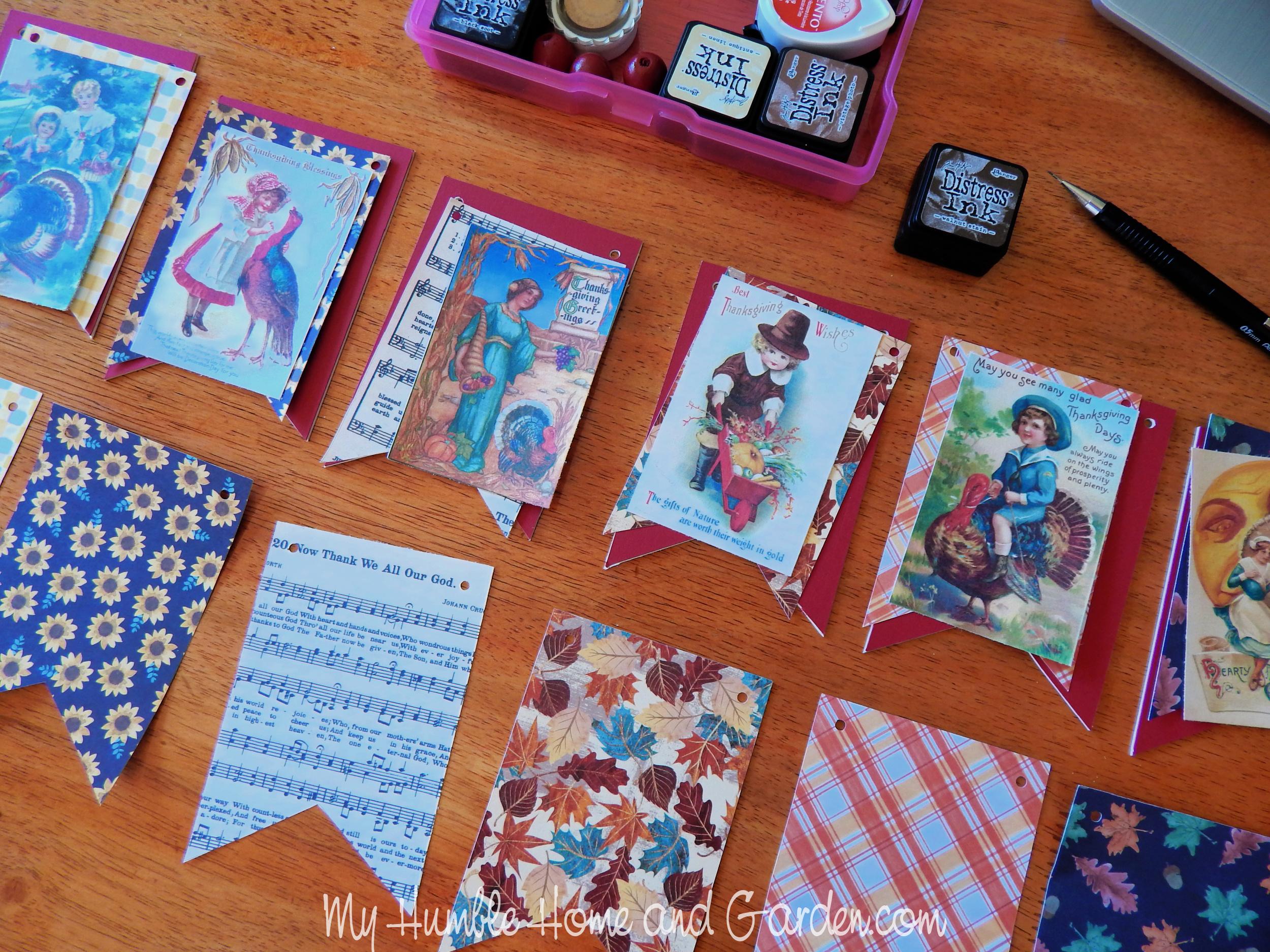 How to Make a Vintage-Inspired Mini Thanksgiving – Lay out the mat board pennants, the decorative paper pennants, and the vintage graphics. #Thanksgivingbanner