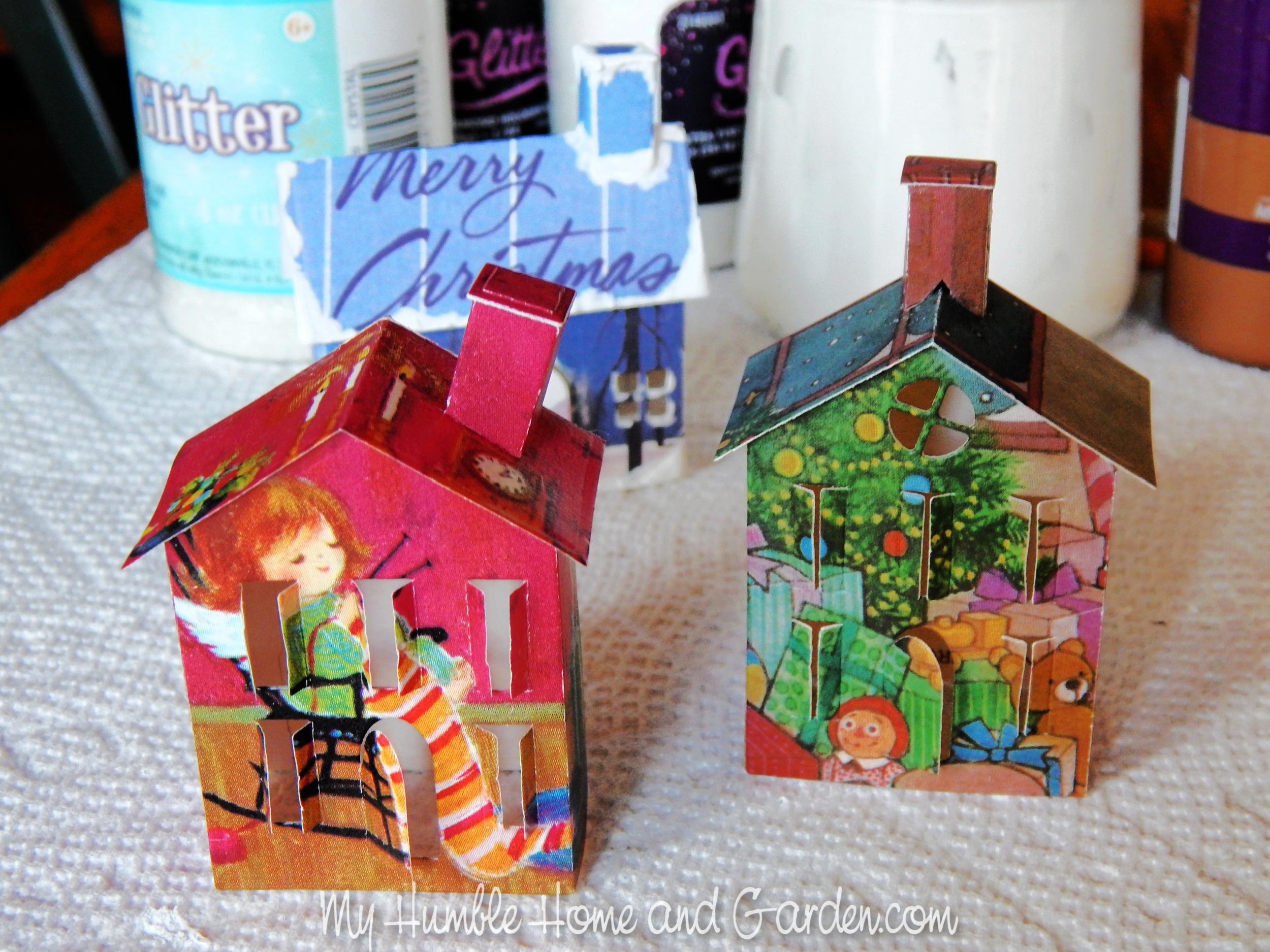 How to Make Putz Houses from Christmas Cards – Flat chimney on the left and angle cut on the right. #putzhouses #Christmascraft #putzhousesfromChristmascards