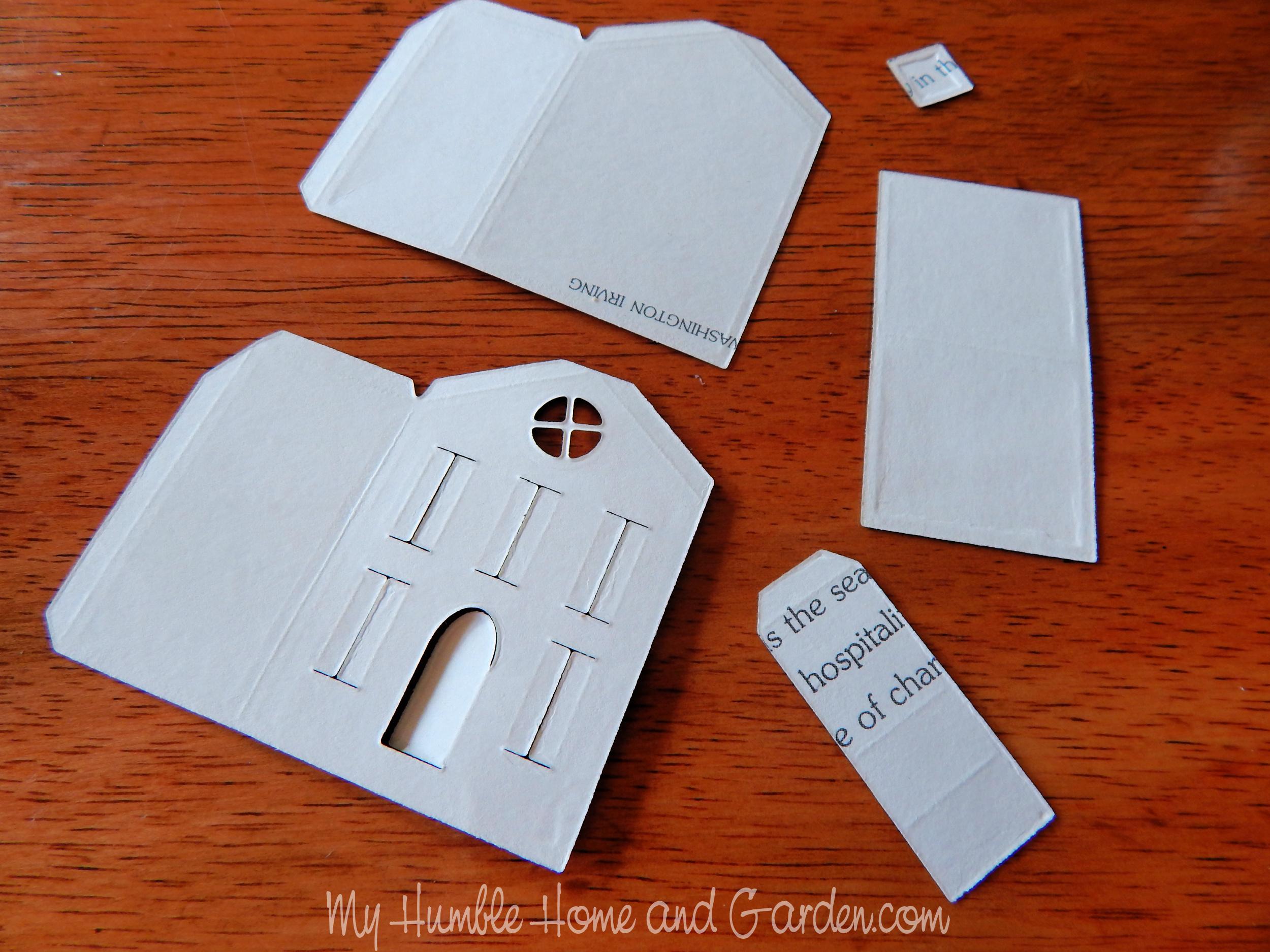 How to Make Putz Houses from Christmas Cards – Front, Back, roof, chimney, and cap cutouts. #putzhouses #putzhousesfromChristmascards #papercraft