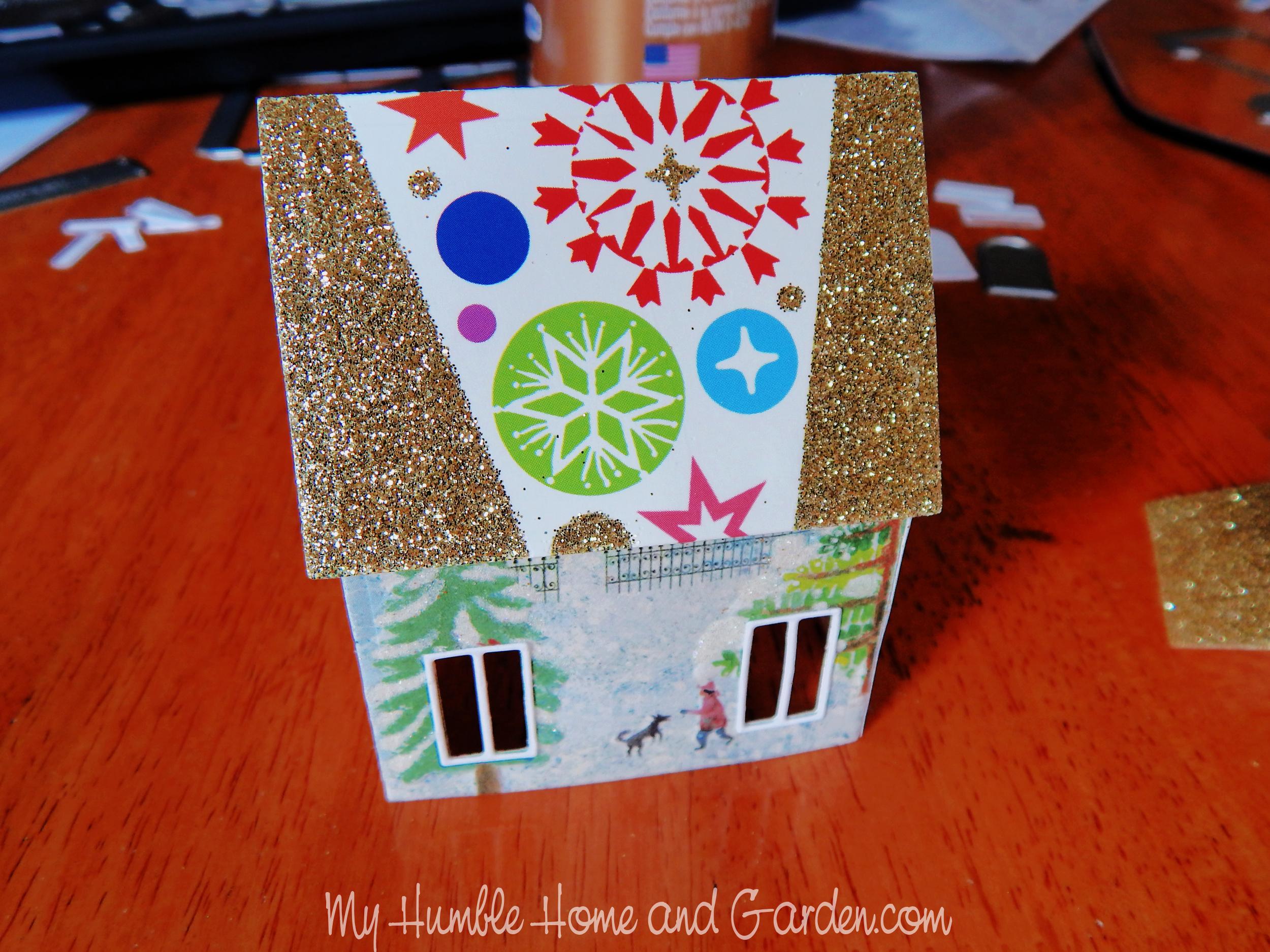How to Make Bigger Putz Houses from Christmas Cards -Adhere the backside of the roof. #putzhouses #putzhousesfromChristmascards