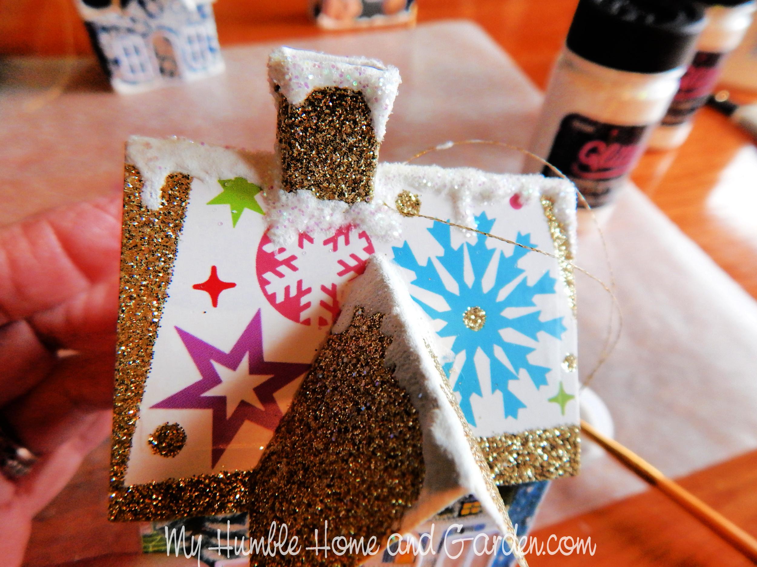 How to Make Bigger Putz Houses from Paint glue onto the snow and sprinkle with glitter. Christmas Cards – #putzhouses #putzhousesfromChristmascards