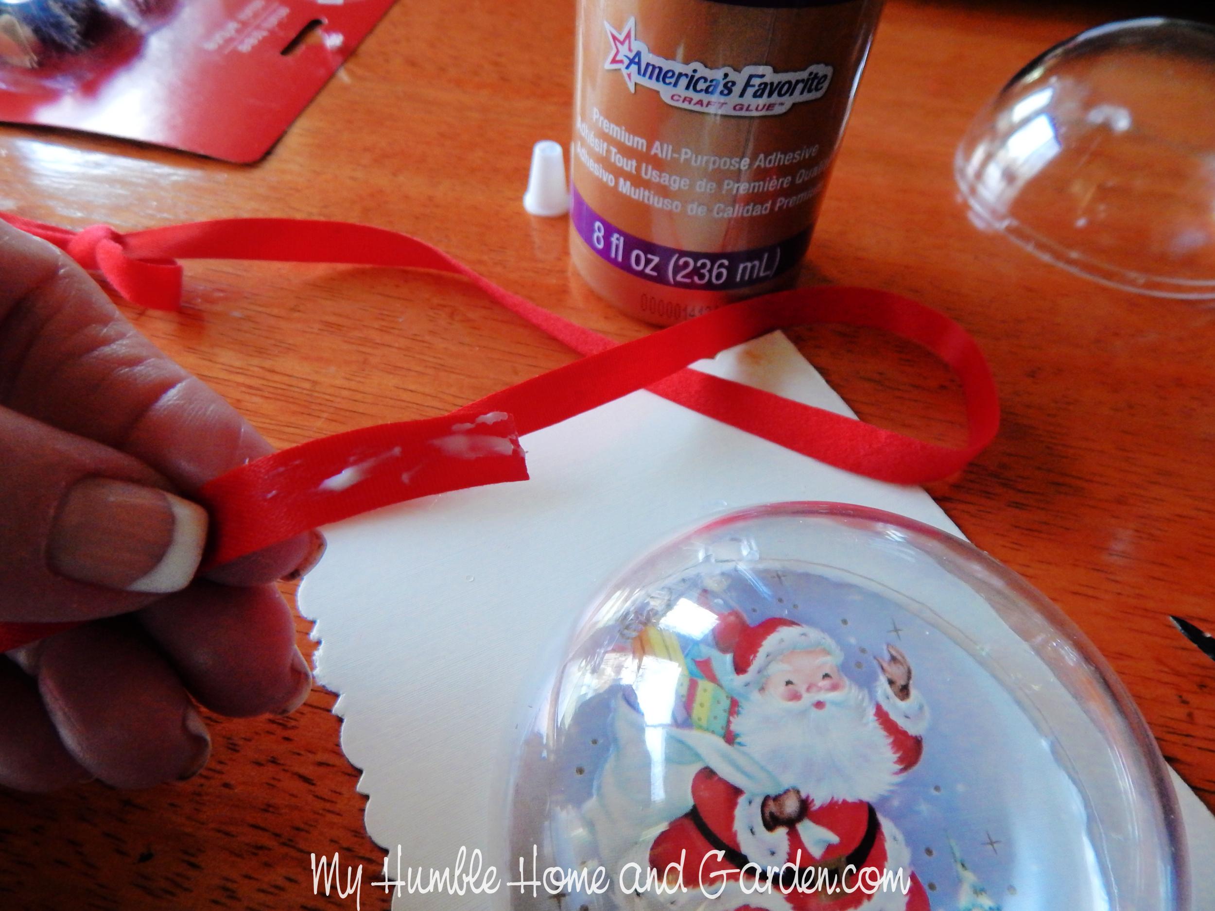 Recycle Christmas Cards – Easy Ornament Frame Decor You’ll Love – Glue the red velvet ribbon to the outer edge of the half-ornament.