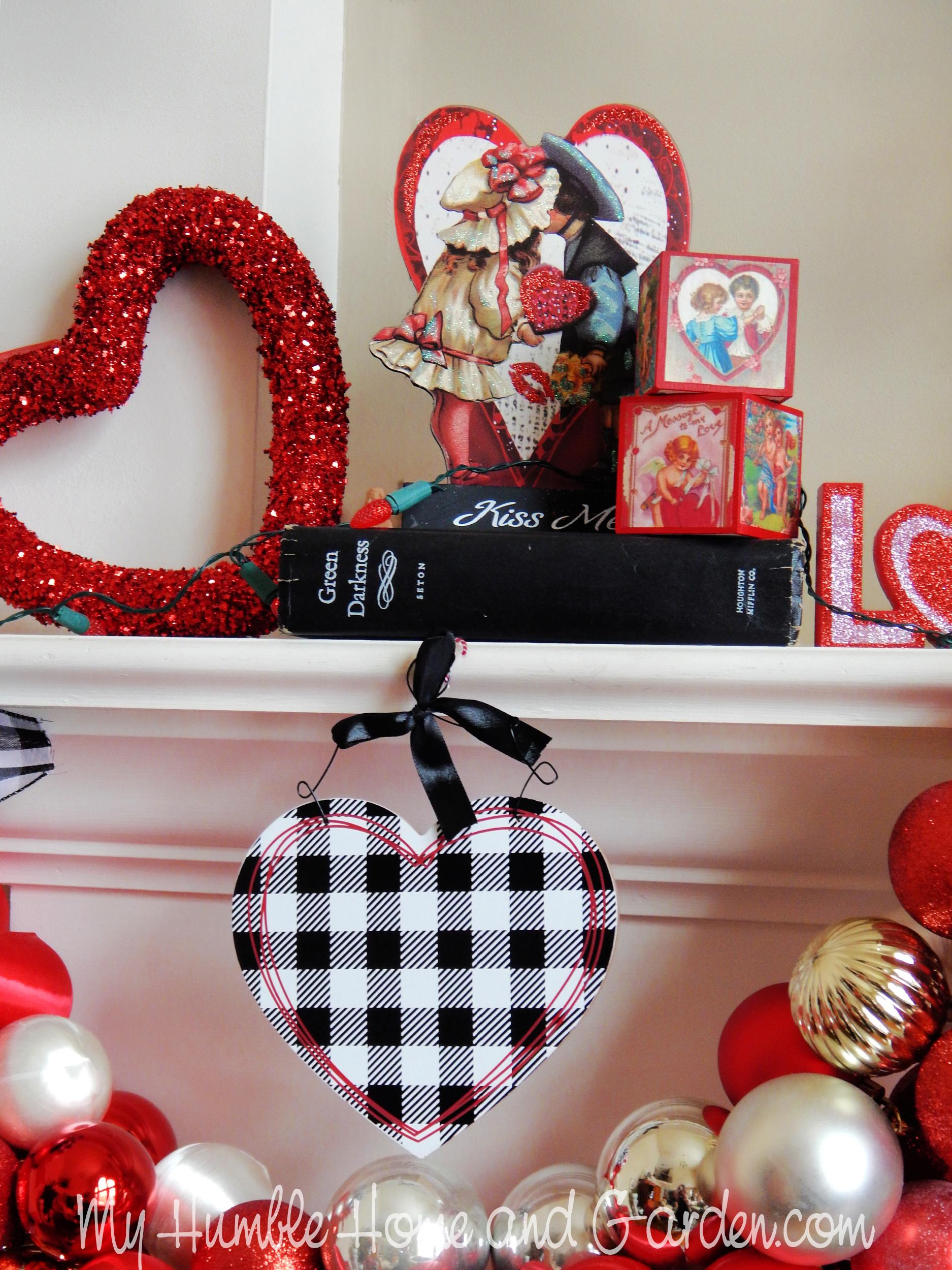 Happy Valentine’s Day Mantel Decor Inspiration – Closeup of Valentine mantel. #valentinedecor #valentinemantel #valentinedecorations