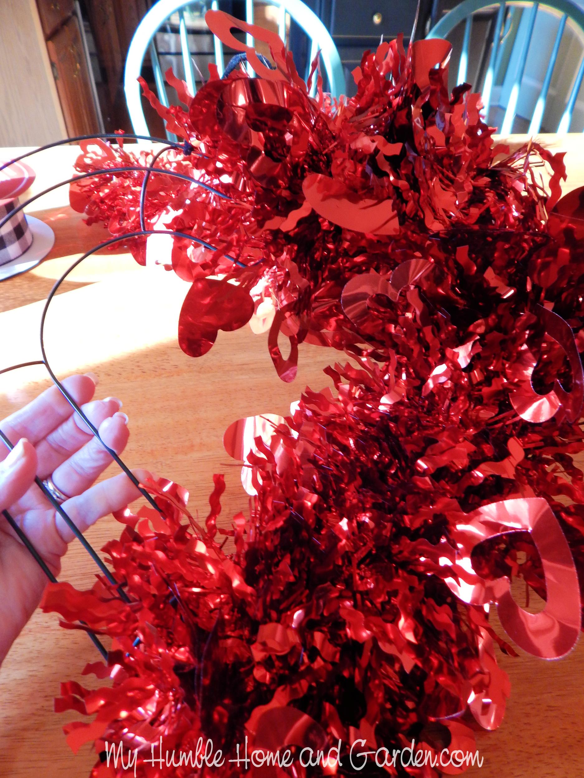 A few of the larger tinsel hearts on the wreath didn’t seem to be necessary, didn’t add anything, and were a little distracting. I clipped those off with scissors.